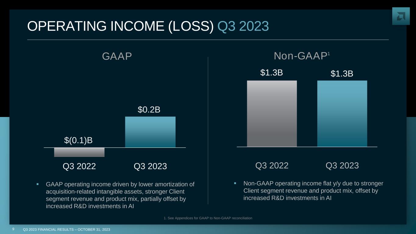 Q3 2023 FINANCIAL RESULTS – OCTOBER 31, 20238 GROSS MARGIN Q3 2023 1. See Appendices for GAAP to Non-GAAP reconciliation ▪ Non-GAAP gross margin increase primarily driven by stronger Client segment revenue and product mix Non-GAAP1 42% 47% Q3 2022 Q3 2023 GAAP ▪ GAAP gross margin increase driven by lower amortization of acquisition-related intangible assets, stronger Client segment revenue and product mix 50% 51% Q3 2022 Q3 2023