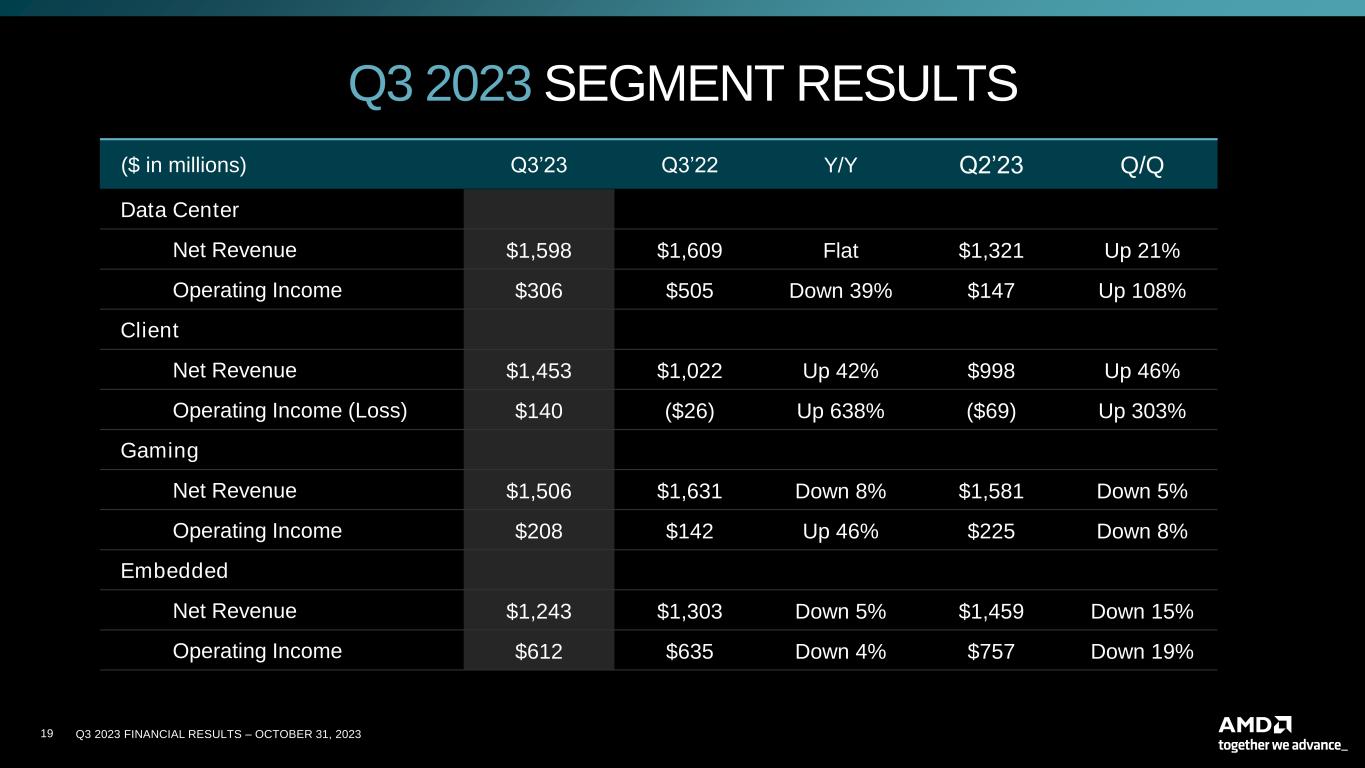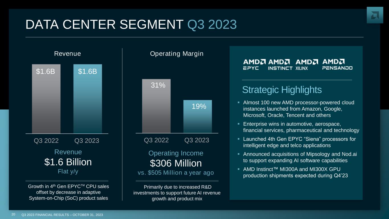Q3 2023 FINANCIAL RESULTS – OCTOBER 31, 202319 Q3 2023 SEGMENT RESULTS ($ in millions) Q3’23 Q3’22 Y/Y Q2’23 Q/Q Data Center Net Revenue $1,598 $1,609 Flat $1,321 Up 21% Operating Income $306 $505 Down 39% $147 Up 108% Client Net Revenue $1,453 $1,022 Up 42% $998 Up 46% Operating Income (Loss) $140 ($26) Up 638% ($69) Up 303% Gaming Net Revenue $1,506 $1,631 Down 8% $1,581 Down 5% Operating Income $208 $142 Up 46% $225 Down 8% Embedded Net Revenue $1,243 $1,303 Down 5% $1,459 Down 15% Operating Income $612 $635 Down 4% $757 Down 19%