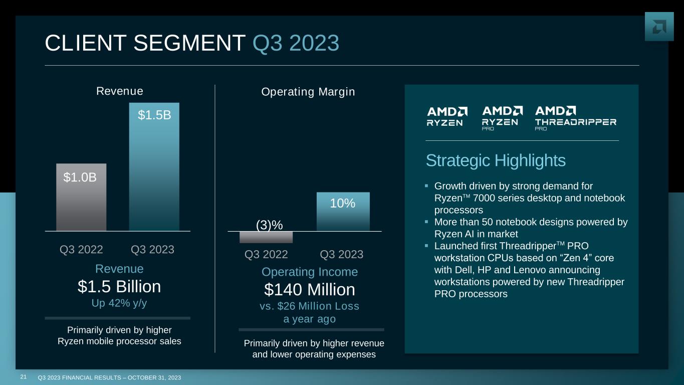 Q3 2023 FINANCIAL RESULTS – OCTOBER 31, 202320 DATA CENTER SEGMENT Q3 2023 ▪ Almost 100 new AMD processor-powered cloud instances launched from Amazon, Google, Microsoft, Oracle, Tencent and others ▪ Enterprise wins in automotive, aerospace, financial services, pharmaceutical and technology ▪ Launched 4th Gen EPYC “Siena” processors for intelligent edge and telco applications ▪ Announced acquisitions of Mipsology and Nod.ai to support expanding AI software capabilities ▪ AMD Instinct™ MI300A and MI300X GPU production shipments expected during Q4’23 Strategic Highlights $1.6B $1.6B Q3 2022 Q3 2023 31% 19% Q3 2022 Q3 2023 Revenue Operating Margin Revenue $1.6 Billion Flat y/y Operating Income $306 Million vs. $505 Million a year ago Primarily due to increased R&D investments to support future AI revenue growth and product mix Growth in 4th Gen EPYCTM CPU sales offset by decrease in adaptive System-on-Chip (SoC) product sales