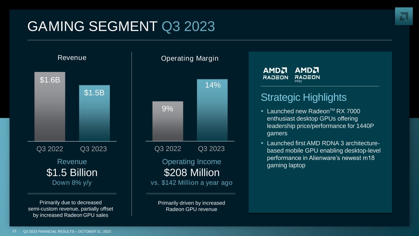 Q3 2023 FINANCIAL RESULTS – OCTOBER 31, 202321 CLIENT SEGMENT Q3 2023 ▪ Growth driven by strong demand for RyzenTM 7000 series desktop and notebook processors ▪ More than 50 notebook designs powered by Ryzen AI in market ▪ Launched first ThreadripperTM PRO workstation CPUs based on “Zen 4” core with Dell, HP and Lenovo announcing workstations powered by new Threadripper PRO processors Strategic Highlights $1.0B $1.5B Q3 2022 Q3 2023 (3)% 10% Q3 2022 Q3 2023 Revenue Operating Margin Revenue $1.5 Billion Up 42% y/y Primarily driven by higher Ryzen mobile processor sales Operating Income $140 Million vs. $26 Million Loss a year ago Primarily driven by higher revenue and lower operating expenses