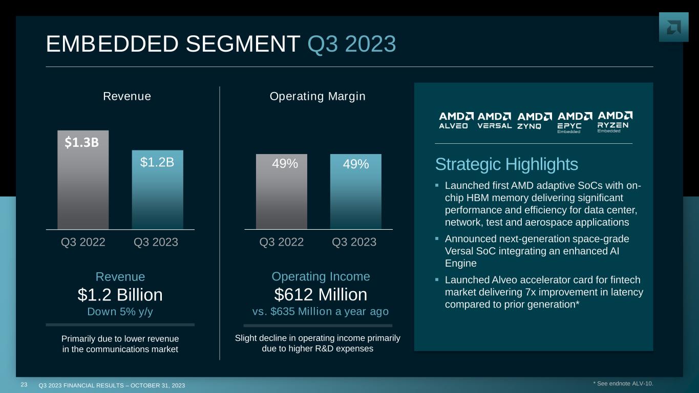 Q3 2023 FINANCIAL RESULTS – OCTOBER 31, 202322 9% 14% Q3 2022 Q3 2023 GAMING SEGMENT Q3 2023 ▪ Launched new RadeonTM RX 7000 enthusiast desktop GPUs offering leadership price/performance for 1440P gamers ▪ Launched first AMD RDNA 3 architecture- based mobile GPU enabling desktop-level performance in Alienware’s newest m18 gaming laptop Strategic Highlights $1.6B $1.5B Q3 2022 Q3 2023 Revenue Operating Margin Revenue $1.5 Billion Down 8% y/y Operating Income $208 Million vs. $142 Million a year ago Primarily driven by increased Radeon GPU revenue Primarily due to decreased semi-custom revenue, partially offset by increased Radeon GPU sales