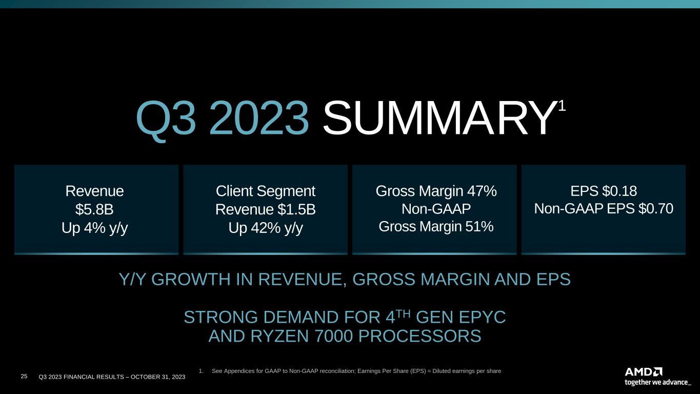 Q3 2023 FINANCIAL RESULTS – OCTOBER 31, 202324 ($ in millions) Q4’23 Revenue ~$6.1 Billion +/- $300 Million Increase of ~9% y/y and ~5% q/q Gross Margin ~51.5% Operating Expenses ~$1.74 Billion Effective Tax Rate ~13% of pre-tax income Diluted Share Count² ~1.63 Billion shares FINANCIAL OUTLOOK – NON-GAAP1 1. 1. See Cautionary Statement on Slide 2. These forward-looking outlook statements and non-GAAP measures are based on current expectations as of October 31, 2023, and assumptions and beliefs that involve numerous risks and uncertainties. AMD undertakes no intent or obligation to publicly update or revise its outlook statements as a result of new information, future events or otherwise, except as may be required by law. All items, except revenue, are on a non-GAAP basis. Adjustments to arrive at the GAAP financial outlook typically include stock-based compensation, amortization of acquired intangible assets, income tax provision, and other non-recurring items such as impairment charges and acquisition-related costs. The timing and impact of such adjustments are dependent on future events that are typically uncertain or outside of AMD's control, therefore, a reconciliation to equivalent GAAP measures is not practicable at this time. 2. 2. Refer to Diluted Share Count overview in the Appendices