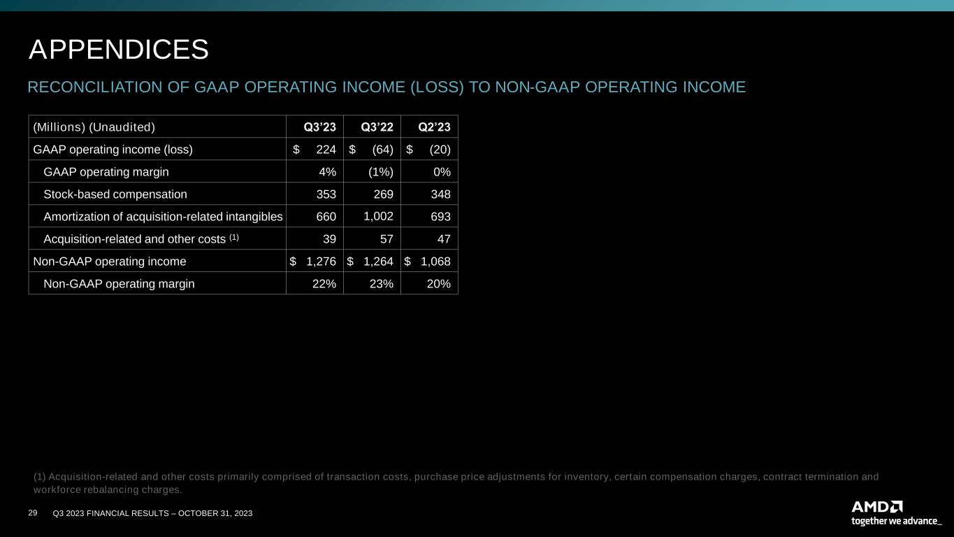 Q3 2023 FINANCIAL RESULTS – OCTOBER 31, 202328 RECONCILIATION OF GAAP TO NON-GAAP GROSS PROFIT AND GROSS MARGIN (Millions) (Unaudited) Q3’22 Q4’22 Q1’23 Q2’23 Q3’23 GAAP gross profit $ 2,354 $ 2,403 $ 2,359 $ 2,443 $ 2,747 GAAP gross margin 42% 43% 44% 46% 47% Stock-based compensation 8 9 8 10 6 Amortization of acquisition-related intangibles 412 443 305 212 210 Acquisition-related and other costs (1) 2 4 3 - - Non-GAAP gross profit $ 2,776 $ 2,859 $ 2,675 $ 2,665 $ 2,963 Non-GAAP gross margin 50% 51% 50% 50% 51% RECONCILIATION OF GAAP TO NON-GAAP OPERATING EXPENSES (Millions) (Unaudited) Q3’23 Q3’22 Q2’23 GAAP operating expenses $ 2,533 $ 2,426 $ 2,471 GAAP operating expenses/revenue % 44% 44% 46% Stock-based compensation 347 261 338 Amortization of acquisition-related intangibles 450 590 481 Acquisition-related and other costs (1) 39 55 47 Non-GAAP operating expenses $ 1,697 $ 1,520 $ 1,605 Non-GAAP operating expenses/revenue % 29% 27% 30% APPENDICES (1) Acquisition-related and other costs primarily comprised of transaction costs, purchase price adjustments for inventory, certain compensation charges, contract termination and workforce rebalancing charges.
