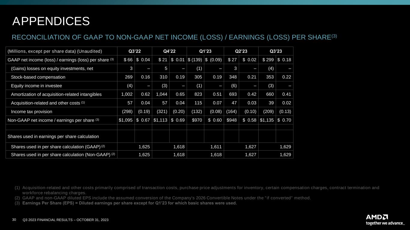 Q3 2023 FINANCIAL RESULTS – OCTOBER 31, 202329 APPENDICES RECONCILIATION OF GAAP OPERATING INCOME (LOSS) TO NON-GAAP OPERATING INCOME (Millions) (Unaudited) Q3’23 Q3’22 Q2’23 GAAP operating income (loss) $ 224 $ (64) $ (20) GAAP operating margin 4% (1%) 0% Stock-based compensation 353 269 348 Amortization of acquisition-related intangibles 660 1,002 693 Acquisition-related and other costs (1) 39 57 47 Non-GAAP operating income $ 1,276 $ 1,264 $ 1,068 Non-GAAP operating margin 22% 23% 20% (1) Acquisition-related and other costs primarily comprised of transaction costs, purchase price adjustments for inventory, certain compensation charges, contract termination and workforce rebalancing charges.
