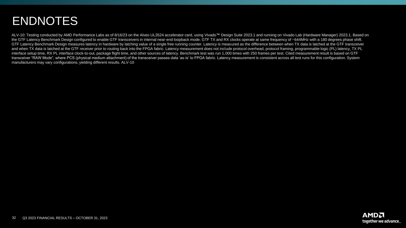 Q3 2023 FINANCIAL RESULTS – OCTOBER 31, 202332 ENDNOTES ALV-10: Testing conducted by AMD Performance Labs as of 8/16/23 on the Alveo UL3524 accelerator card, using Vivado™ Design Suite 2023.1 and running on Vivado Lab (Hardware Manager) 2023.1. Based on the GTF Latency Benchmark Design configured to enable GTF transceivers in internal near-end loopback mode. GTF TX and RX clocks operate at same frequency of ~644MHz with a 180 degrees phase shift. GTF Latency Benchmark Design measures latency in hardware by latching value of a single free running counter. Latency is measured as the difference between when TX data is latched at the GTF transceiver and when TX data is latched at the GTF receiver prior to routing back into the FPGA fabric. Latency measurement does not include protocol overhead, protocol framing, programmable logic (PL) latency, TX PL interface setup time, RX PL interface clock-to-out, package flight time, and other sources of latency. Benchmark test was run 1,000 times with 250 frames per test. Cited measurement result is based on GTF transceiver “RAW Mode”, where PCS (physical medium attachment) of the transceiver passes data ‘as-is’ to FPGA fabric. Latency measurement is consistent across all test runs for this configuration. System manufacturers may vary configurations, yielding different results. ALV-10