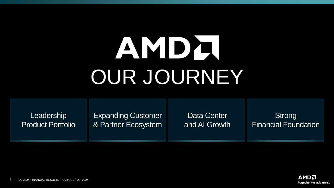 2 Q3 2024 FINANCIAL RESULTS – OCTOBER 29, 20242 CAUTIONARY STATEMENT This presentation contains forward-looking statements concerning Advanced Micro Devices, Inc. (AMD), such as the features, functionality, performance, availability, timing and expected benefits of AMD products; AMD's large growth opportunities across diverse set of markets; AMD's anticipated acquisition of ZT Systems and the anticipated timing of the transaction; the expected benefits of AMD's acquisition of ZT Systems; AMD’s expected fourth quarter 2024 financial outlook, including revenue, non-GAAP gross margin, non-GAAP operating expenses, non-GAAP Interest Expense/Other Income (Expense), net, non-GAAP tax rate and diluted share count; AMD’s large and compelling TAM; AMD’s ability to expand Data Center and AI leadership; and AMD’s ability to drive long-term shareholder returns, which are made pursuant to the Safe Harbor provisions of the Private Securities Litigation Reform Act of 1995. Forward-looking statements are commonly identified by words such as "would," "may," "expects," "believes," "plans," "intends," "projects" and other terms with similar meaning. Investors are cautioned that the forward-looking statements in this presentation are based on current beliefs, assumptions and expectations, speak only as of the date of this presentation and involve risks and uncertainties that could cause actual results to differ materially from current expectations. Such statements are subject to certain known and unknown risks and uncertainties, many of which are difficult to predict and generally beyond AMD's control, that could cause actual results and other future events to differ materially from those expressed in, or implied or projected by, the forward-looking information and statements. Material factors that could cause actual results to differ materially from current expectations include, without limitation, the following: Intel Corporation’s dominance of the microprocessor market and its aggressive business practices; Nvidia’s dominance in the graphics processing unit market and its aggressive business practices; the cyclical nature of the semiconductor industry; market conditions of the industries in which AMD products are sold; loss of a significant customer; competitive markets in which AMD’s products are sold; economic and market uncertainty; quarterly and seasonal sales patterns; AMD's ability to adequately protect its technology or other intellectual property; unfavorable currency exchange rate fluctuations; ability of third party manufacturers to manufacture AMD's products on a timely basis in sufficient quantities and using competitive technologies; availability of essential equipment, materials, substrates or manufacturing processes; ability to achieve expected manufacturing yields for AMD’s products; AMD's ability to introduce products on a timely basis with expected features and performance levels; AMD's ability to generate revenue from its semi-custom SoC products; potential security vulnerabilities; potential security incidents including IT outages, data loss, data breaches and cyberattacks; uncertainties involving the ordering and shipment of AMD’s products; AMD’s reliance on third-party intellectual property to design and introduce new products; AMD's reliance on third-party companies for design, manufacture and supply of motherboards, software, memory and other computer platform components; AMD's reliance on Microsoft and other software vendors' support to design and develop software to run on AMD’s products; AMD’s reliance on third-party distributors and add-in-board partners; impact of modification or interruption of AMD’s internal business processes and information systems; compatibility of AMD’s products with some or all industry-standard software and hardware; costs related to defective products; efficiency of AMD's supply chain; AMD's ability to rely on third party supply-chain logistics functions; AMD’s ability to effectively control sales of its products on the gray market; long-term impact of climate change on AMD’s business; impact of government actions and regulations such as export regulations, tariffs and trade protection measures; AMD’s ability to realize its deferred tax assets; potential tax liabilities; current and future claims and litigation; impact of environmental laws, conflict minerals related provisions and other laws or regulations; evolving expectations from governments, investors, customers and other stakeholders regarding corporate responsibility matters; issues related to the responsible use of AI; restrictions imposed by agreements governing AMD’s notes, the guarantees of Xilinx’s notes and the revolving credit agreement; the ability to obtain applicable regulatory approvals for the acquisition of ZT Systems in a timely manner or otherwise and to satisfy other closing conditions to the transaction; impact of acquisitions, joint ventures and/or investments on AMD’s business and AMD’s ability to integrate acquired businesses; impact of any impairment of the combined company’s assets; political, legal and economic risks and natural disasters; future impairments of technology license purchases; AMD’s ability to attract and retain qualified personnel; and AMD’s stock price volatility. Investors are urged to review in detail the risks and uncertainties in AMD’s Securities and Exchange Commission filings, including but not limited to AMD’s most recent reports on Forms 10-K and 10-Q. NON-GAAP FINANCIAL MEASURES In this presentation, in addition to GAAP financial results, AMD has provided non-GAAP financial measures including non-GAAP gross profit and margin, non-GAAP operating expenses, non-GAAP operating expenses/revenue %, non-GAAP operating income, non-GAAP operating margin, non-GAAP net income and non-GAAP diluted earnings per share. AMD uses a normalized tax rate in its computation of the non-GAAP income tax provision to