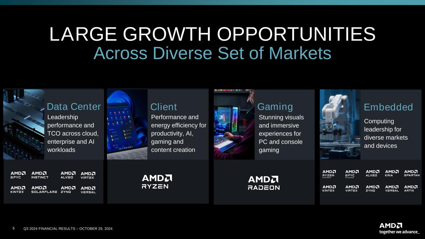 4 Q3 2024 FINANCIAL RESULTS – OCTOBER 29, 2024 Leadership Foundational IP Accelerating innovation in silicon architecture, advanced packaging, and software Open, Proven Software Ecosystem Delivering a productive, performant, and accessible development stack Broad Product Portfolio Scaling IP across a breadth of platforms, systems and solutions for diverse markets Deep, Collaborative Partnerships Computing partner of choice across AI, the data center, embedded, PCs, and gaming HIGH PERFORMANCE COMPUTING LEADERSHIP Our Strategy