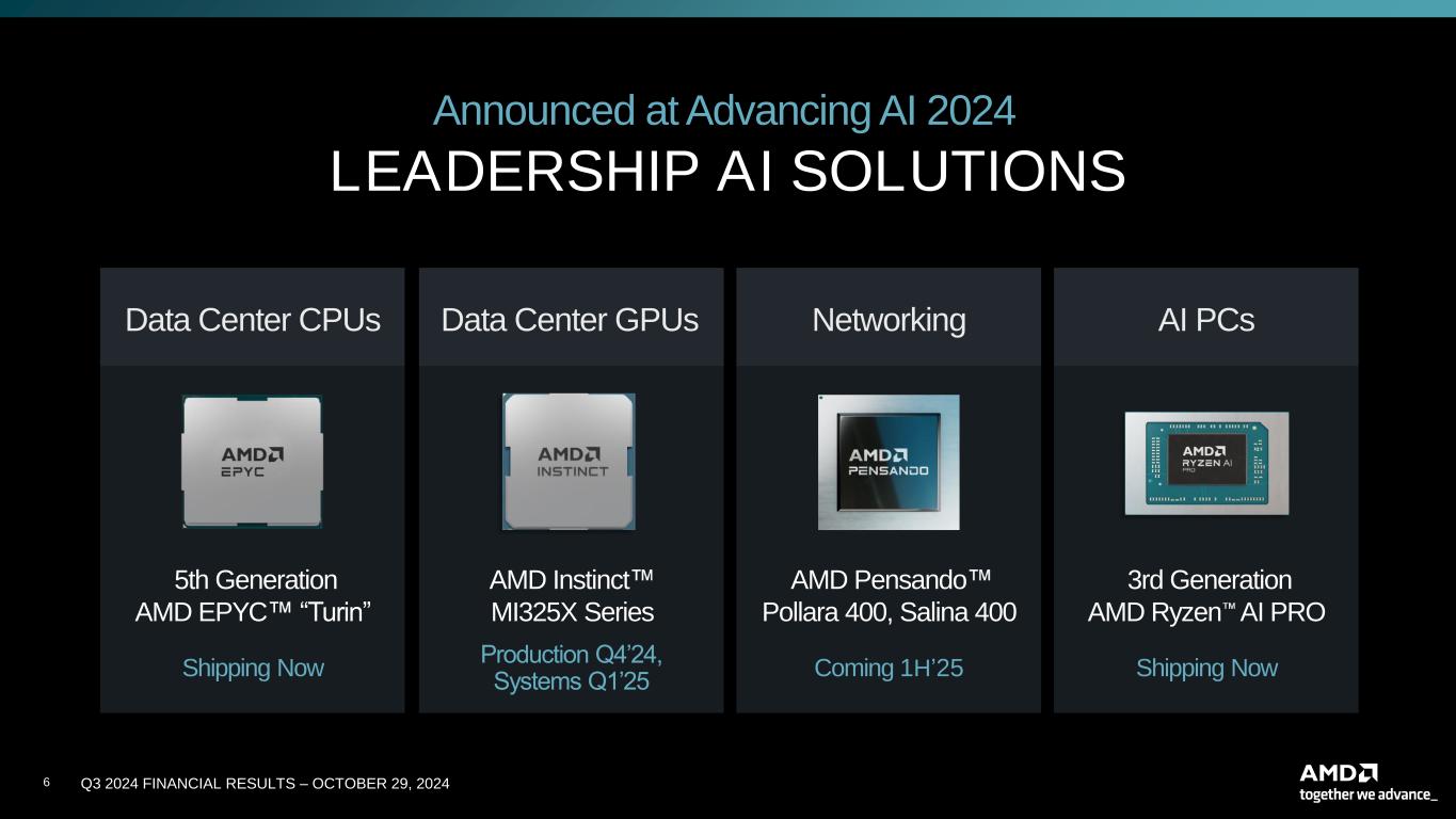 5 Q3 2024 FINANCIAL RESULTS – OCTOBER 29, 20245 LARGE GROWTH OPPORTUNITIES Across Diverse Set of Markets Embedded Computing leadership for diverse markets and devices Client Performance and energy efficiency for productivity, AI, gaming and content creation Data Center Leadership performance and TCO across cloud, enterprise and AI workloads Gaming Stunning visuals and immersive experiences for PC and console gaming