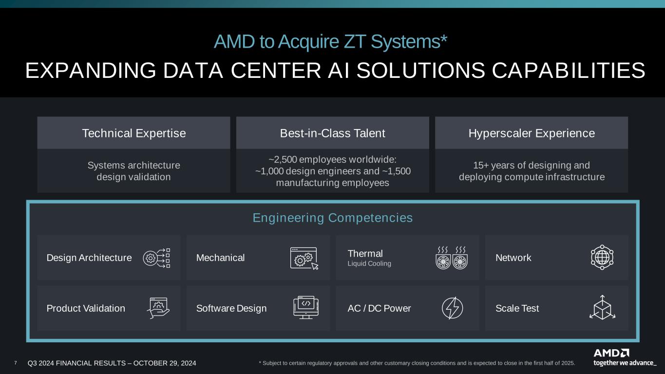 6 Q3 2024 FINANCIAL RESULTS – OCTOBER 29, 2024 Networking AMD Pensando Pollara 400, Salina 400 Data Center CPUs 5th Generation AMD EPYC “Turin” Data Center GPUs AMD Instinct MI325X Series LEADERSHIP AI SOLUTIONS Announced at Advancing AI 2024 Coming 1H’25 Production Q4’24, Systems Q1’25 Shipping Now AI PCs 3rd Generation AMD Ryzen AI PRO Shipping Now