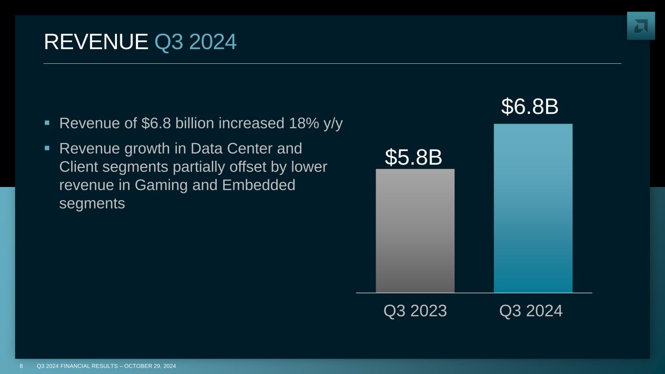 7 Q3 2024 FINANCIAL RESULTS – OCTOBER 29, 20247 Systems architecture design validation ~2,500 employees worldwide: ~1,000 design engineers and ~1,500 manufacturing employees 15+ years of designing and deploying compute infrastructure Technical Expertise Best-in-Class Talent Hyperscaler Experience Engineering Competencies Thermal Liquid Cooling Network Scale Test Mechanical Software Design Design Architecture Product Validation AC / DC Power 7 EXPANDING DATA CENTER AI SOLUTIONS CAPABILITIES AMD to Acquire ZT Systems* Q3 2024 FINANCIAL RESULTS – OCTOBER 29, 2024 * Subject to certain regulatory approvals and other customary closing conditions and is expected to close in the first half of 2025.