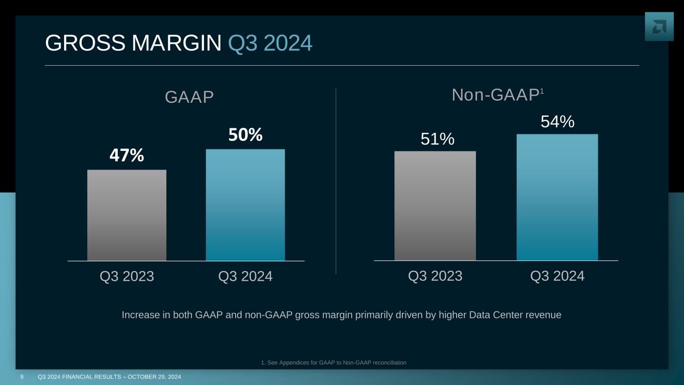 Q3 2024 FINANCIAL RESULTS – OCTOBER 29, 20248 REVENUE Q3 2024 ▪ Revenue of $6.8 billion increased 18% y/y ▪ Revenue growth in Data Center and Client segments partially offset by lower revenue in Gaming and Embedded segments $5.8B $6.8B Q3 2023 Q3 2024