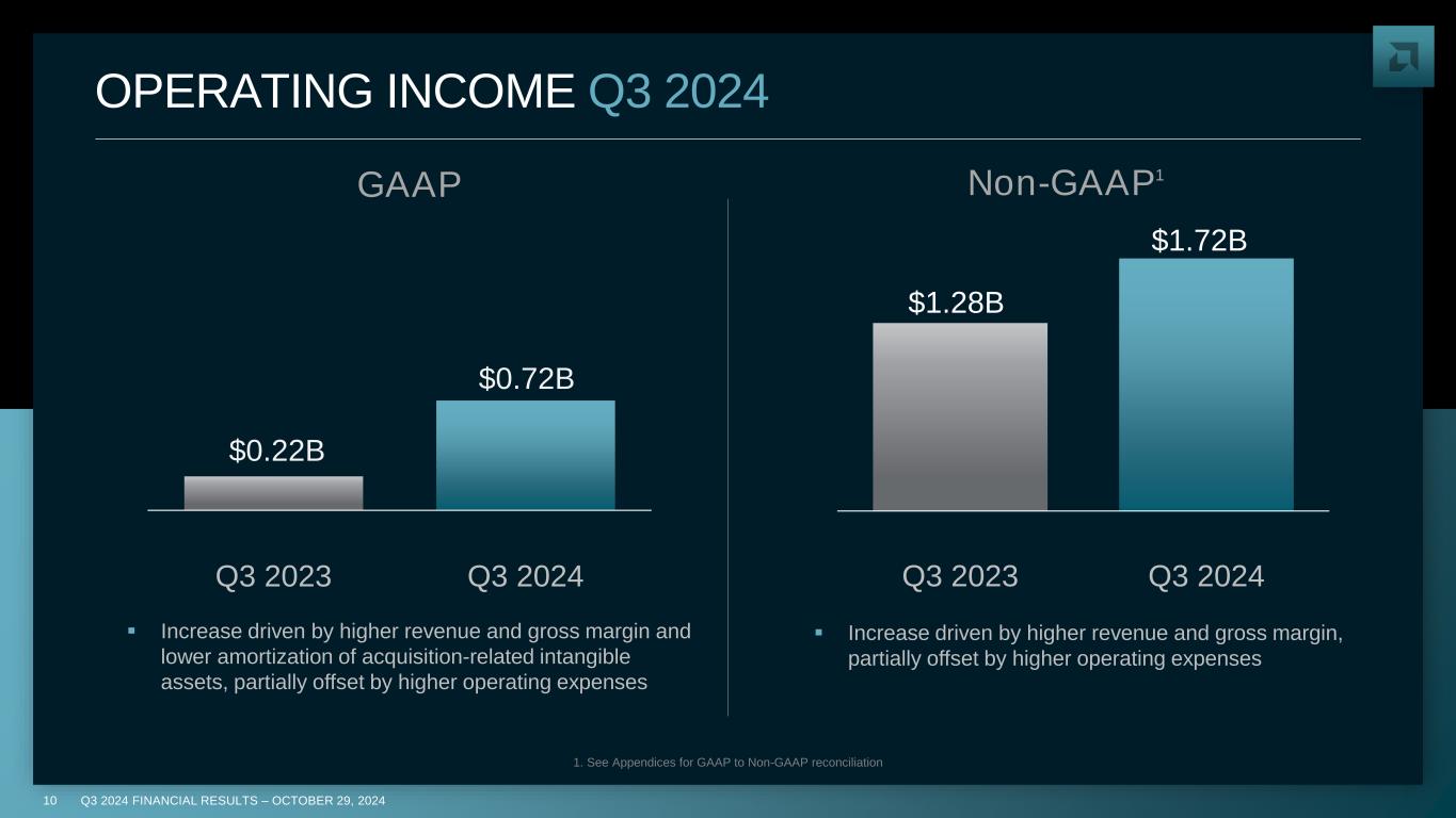 Q3 2024 FINANCIAL RESULTS – OCTOBER 29, 20249 GROSS MARGIN Q3 2024 1. See Appendices for GAAP to Non-GAAP reconciliation Non-GAAP1 47% 50% Q3 2023 Q3 2024 GAAP Increase in both GAAP and non-GAAP gross margin primarily driven by higher Data Center revenue 51% 54% Q3 2023 Q3 2024