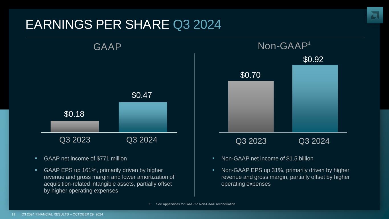 Q3 2024 FINANCIAL RESULTS – OCTOBER 29, 202410 Q3 2023 Q3 2024 $0.22B $0.72B OPERATING INCOME Q3 2024 1. See Appendices for GAAP to Non-GAAP reconciliation GAAP Non-GAAP1 $1.28B $1.72B Q3 2023 Q3 2024 ▪ Increase driven by higher revenue and gross margin and lower amortization of acquisition-related intangible assets, partially offset by higher operating expenses ▪ Increase driven by higher revenue and gross margin, partially offset by higher operating expenses