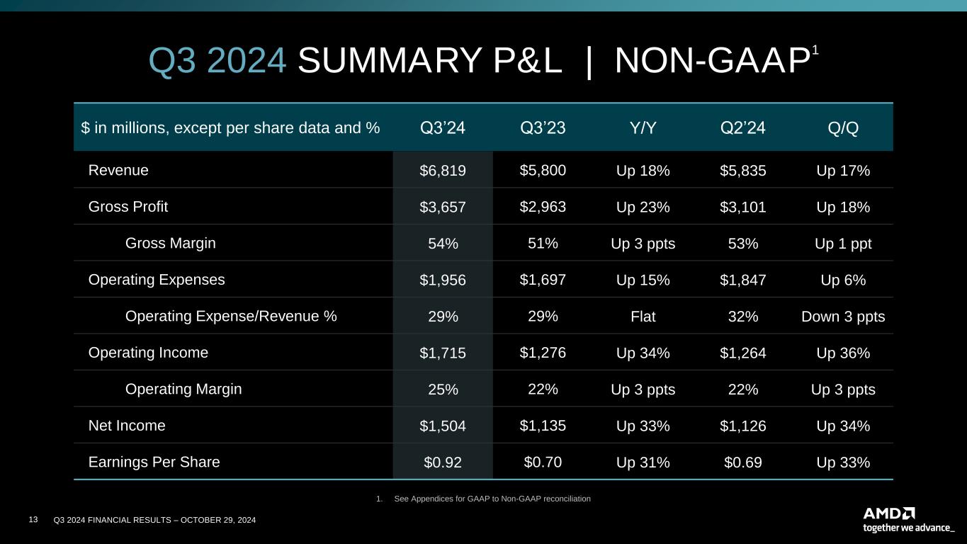 12 Q3 2024 FINANCIAL RESULTS – OCTOBER 29, 2024 $ in millions, except per share data and % Q3’24 Q3’23 Y/Y Q2’24 Q/Q Revenue $6,819 $5,800 Up 18% $5,835 Up 17% Gross Profit $3,419 $2,747 Up 24% $2,864 Up 19% Gross Margin 50% 47% Up 3 ppts 49% Up 1 ppt Operating Expenses $2,709 $2,533 Up 7% $2,605 Up 4% Operating Expense/Revenue % 40% 44% Down 4 ppts 45% Down 5 ppts Operating Income $724 $224 Up 223% $269 Up 169% Operating Margin 11% 4% Up 7 ppts 5% Up 6 ppts Net Income $771 $299 Up 158% $265 Up 191% Earnings Per Share $0.47 $0.18 Up 161% $0.16 Up 194% Q3 2024 SUMMARY P&L | GAAP