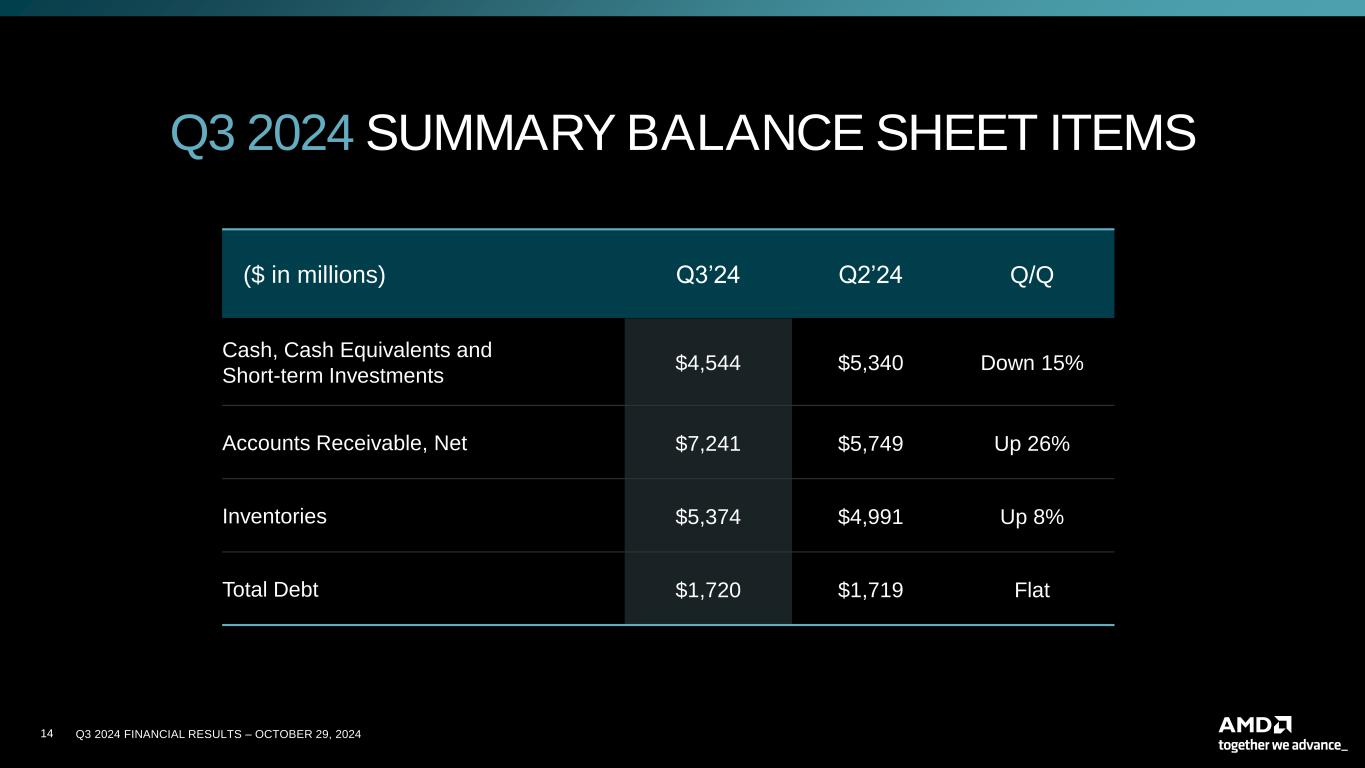 13 Q3 2024 FINANCIAL RESULTS – OCTOBER 29, 2024 $ in millions, except per share data and % Q3’24 Q3’23 Y/Y Q2’24 Q/Q Revenue $6,819 $5,800 Up 18% $5,835 Up 17% Gross Profit $3,657 $2,963 Up 23% $3,101 Up 18% Gross Margin 54% 51% Up 3 ppts 53% Up 1 ppt Operating Expenses $1,956 $1,697 Up 15% $1,847 Up 6% Operating Expense/Revenue % 29% 29% Flat 32% Down 3 ppts Operating Income $1,715 $1,276 Up 34% $1,264 Up 36% Operating Margin 25% 22% Up 3 ppts 22% Up 3 ppts Net Income $1,504 $1,135 Up 33% $1,126 Up 34% Earnings Per Share $0.92 $0.70 Up 31% $0.69 Up 33% Q3 2024 SUMMARY P&L | NON-GAAP 1 1. See Appendices for GAAP to Non-GAAP reconciliation