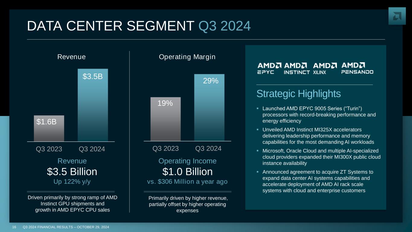 15 Q3 2024 FINANCIAL RESULTS – OCTOBER 29, 2024 Q3 2024 SEGMENT RESULTS ($ in millions) Q3’24 Q3’23 Y/Y Q2’24 Q/Q Data Center Net Revenue $3,549 $1,598 Up 122% $2,834 Up 25% Operating Income $1,041 $306 Up 240% $743 Up 40% Client Net Revenue $1,881 $1,453 Up 29% $1,492 Up 26% Operating Income $276 $140 Up 97% $89 Up 210% Gaming Net Revenue $462 $1,506 Down 69% $648 Down 29% Operating Income $12 $208 Down 94% $77 Down 84% Embedded Net Revenue $927 $1,243 Down 25% $861 Up 8% Operating Income $372 $612 Down 39% $345 Up 8%