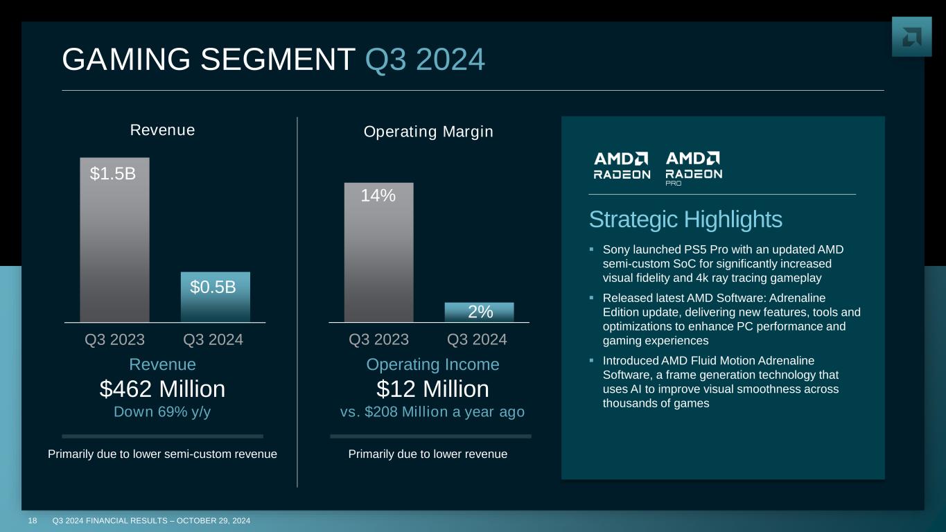 Q3 2024 FINANCIAL RESULTS – OCTOBER 29, 202417 CLIENT SEGMENT Q3 2024 ▪ Introduced new Ryzen AI PRO 300 Series mobile processors, powering next-gen AI PCs for the enterprise with 50+ AI TOPS and delivering extended battery life ▪ Acer, HP, Lenovo and Asus announced new consumer and commercial notebooks supported by Ryzen AI 300 Series mobile processors ▪ Ramped AMD Ryzen 9000 Series processors based on “Zen 5” architecture; on track to launch next-gen Ryzen 9000 X3D processors in Q4’24 ▪ Released Ryzen AI software 1.2 for developers to build AI-enhanced applications and maximize the performance of Ryzen AI CPU, GPU and NPU architecture Strategic Highlights $1.5B $1.9B Q3 2023 Q3 2024 10% 15% Q3 2023 Q3 2024 Revenue Operating Margin Revenue $1.9 Billion Up 29% y/y Primarily driven by strong demand for “Zen 5” AMD Ryzen processors Operating Income $276 Million vs. $140 Million a year ago Primarily driven by higher revenue, partially offset by higher operating expenses