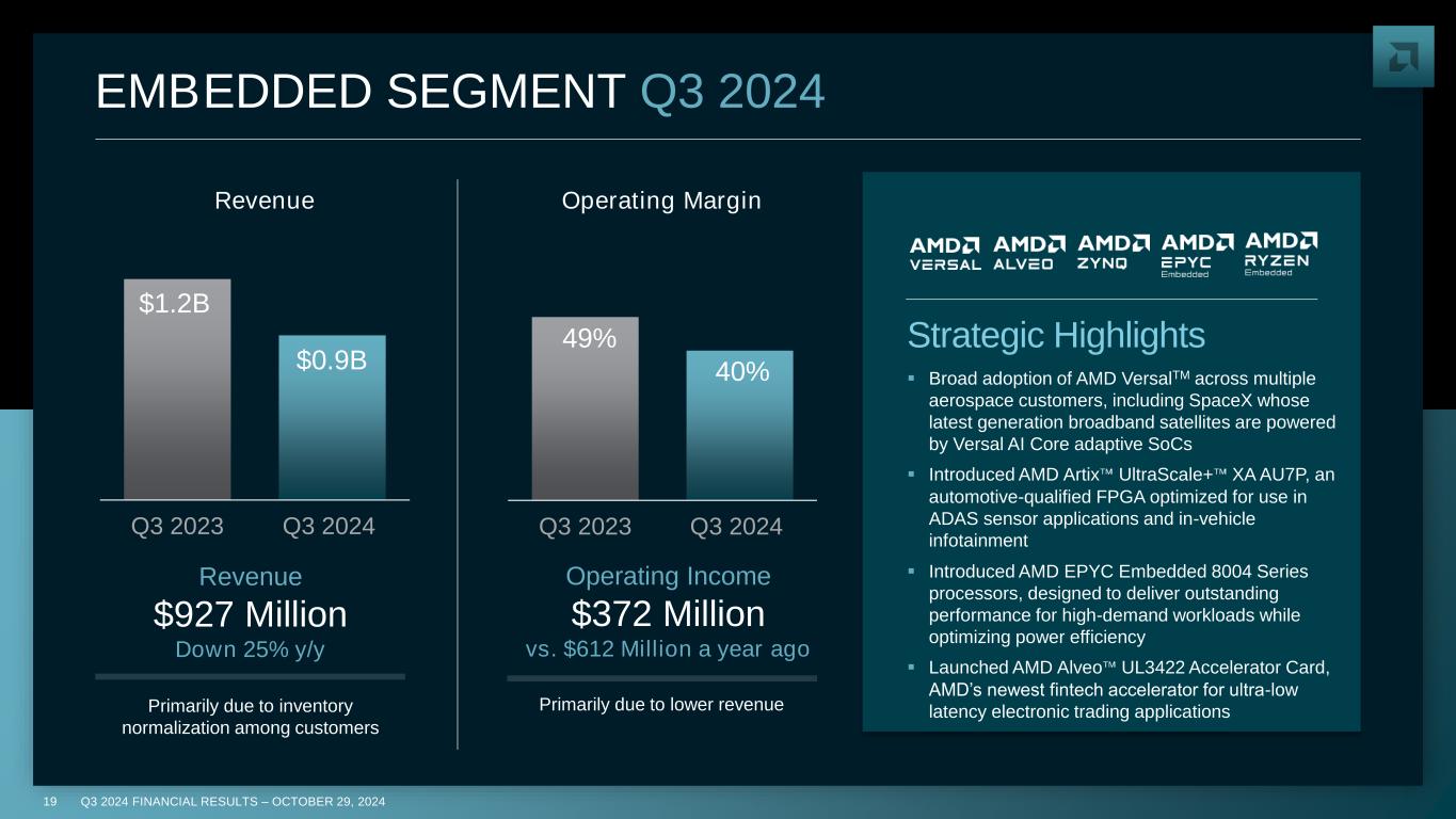 Q3 2024 FINANCIAL RESULTS – OCTOBER 29, 202418 14% 2% Q3 2023 Q3 2024 GAMING SEGMENT Q3 2024 ▪ Sony launched PS5 Pro with an updated AMD semi-custom SoC for significantly increased visual fidelity and 4k ray tracing gameplay ▪ Released latest AMD Software: Adrenaline Edition update, delivering new features, tools and optimizations to enhance PC performance and gaming experiences ▪ Introduced AMD Fluid Motion Adrenaline Software, a frame generation technology that uses AI to improve visual smoothness across thousands of games Strategic Highlights $1.5B $0.5B Q3 2023 Q3 2024 Revenue Operating Margin Revenue $462 Million Down 69% y/y Operating Income $12 Million vs. $208 Million a year ago Primarily due to lower revenuePrimarily due to lower semi-custom revenue
