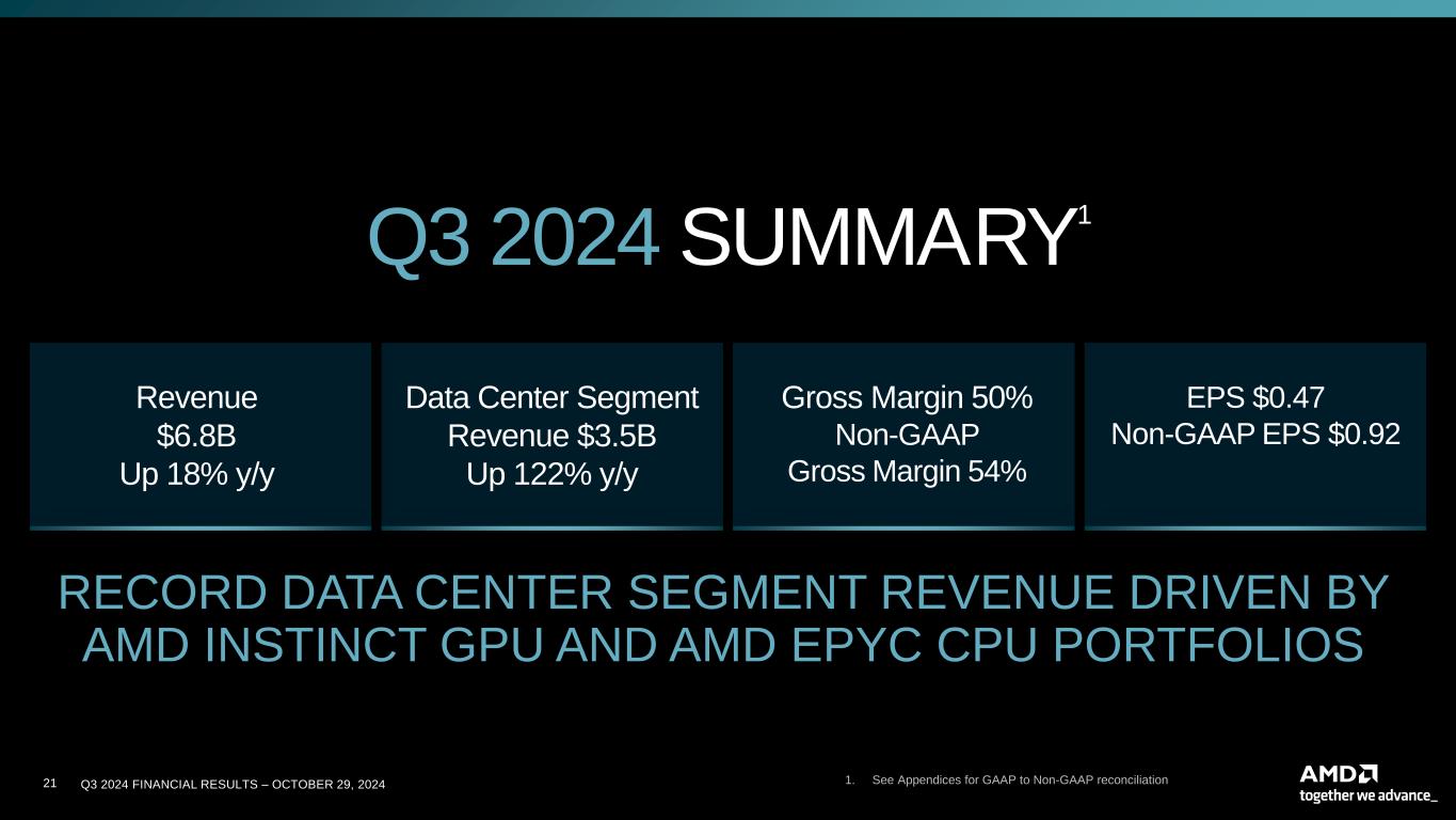20 Q3 2024 FINANCIAL RESULTS – OCTOBER 29, 2024 ($ in millions) Q4’24 Revenue ~$7.5 Billion, +/- $300 Million Gross Margin ~54.0% Operating Expenses ~$2.05 Billion Interest Expense/Other Income (Expense), net ~$17 Million Effective Tax Rate ~13% of pre-tax income Diluted Share Count² ~1.64 Billion shares FINANCIAL OUTLOOK – NON-GAAP1 1. 1. See Cautionary Statement on Slide 2. These forward-looking outlook statements and non-GAAP measures are based on current expectations as of October 29, 2024, and assumptions and beliefs that involve numerous risks and uncertainties. AMD undertakes no intent or obligation to publicly update or revise its outlook statements as a result of new information, future events or otherwise, except as may be required by law. All items, except revenue, are on a non-GAAP basis. Adjustments to arrive at the GAAP financial outlook typically include stock-based compensation, amortization of acquired intangible assets, income tax provision, and other non-recurring items such as impairment charges and acquisition-related costs. The timing and impact of such adjustments are dependent on future events that are typically uncertain or outside of AMD's control, therefore, a reconciliation to equivalent GAAP measures is not practicable at this time. 2. 2. Refer to Diluted Share Count overview in the Appendices