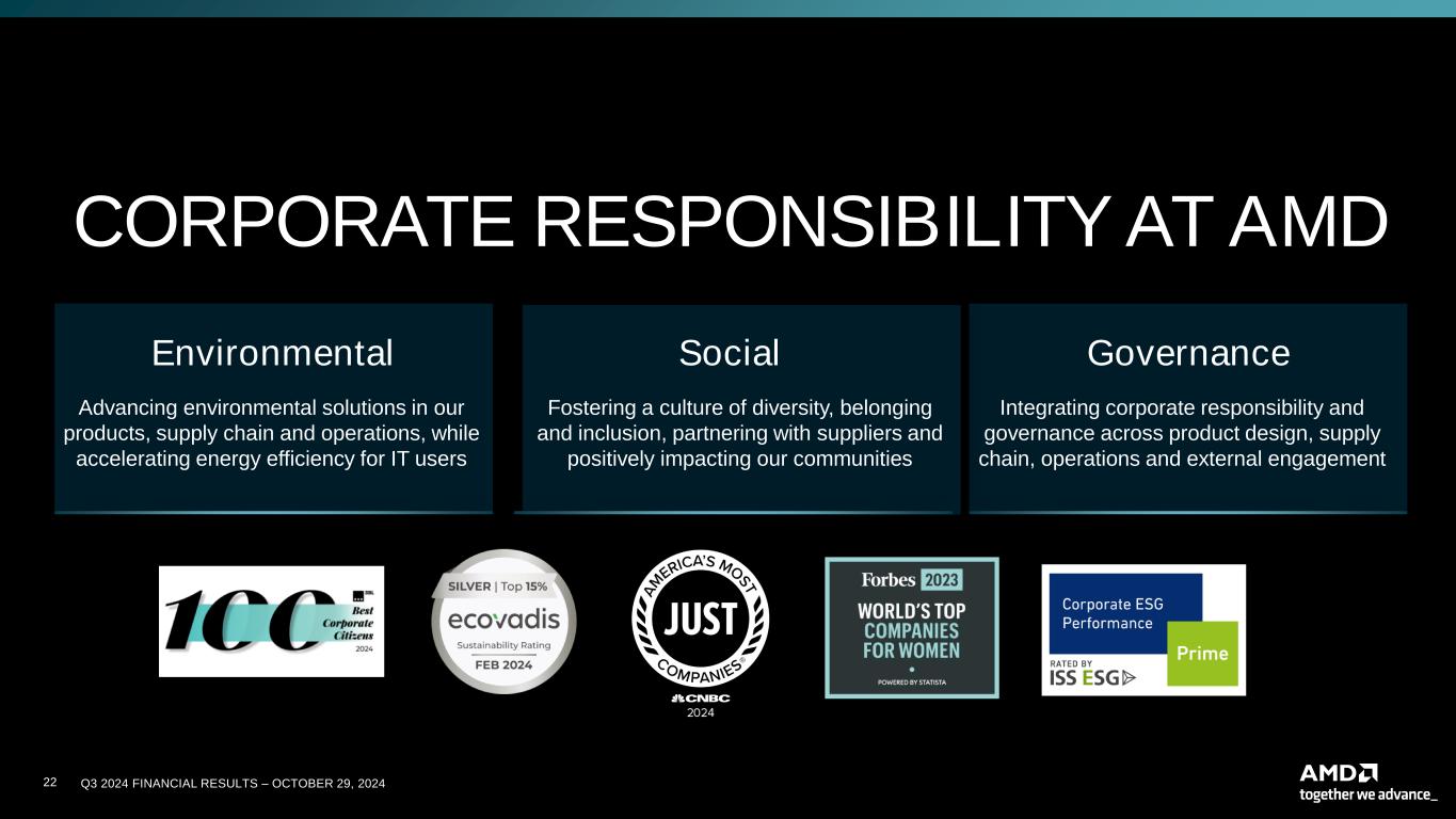 22 Q3 2024 FINANCIAL RESULTS – OCTOBER 29, 20242 CORPORATE RESPONSIBILITY AT AMD Governance Integrating corporate responsibility and governance across product design, supply chain, operations and external engagement Social Fostering a culture of diversity, belonging and inclusion, partnering with suppliers and positively impacting our communities Environmental Advancing environmental solutions in our products, supply chain and operations, while accelerating energy efficiency for IT users