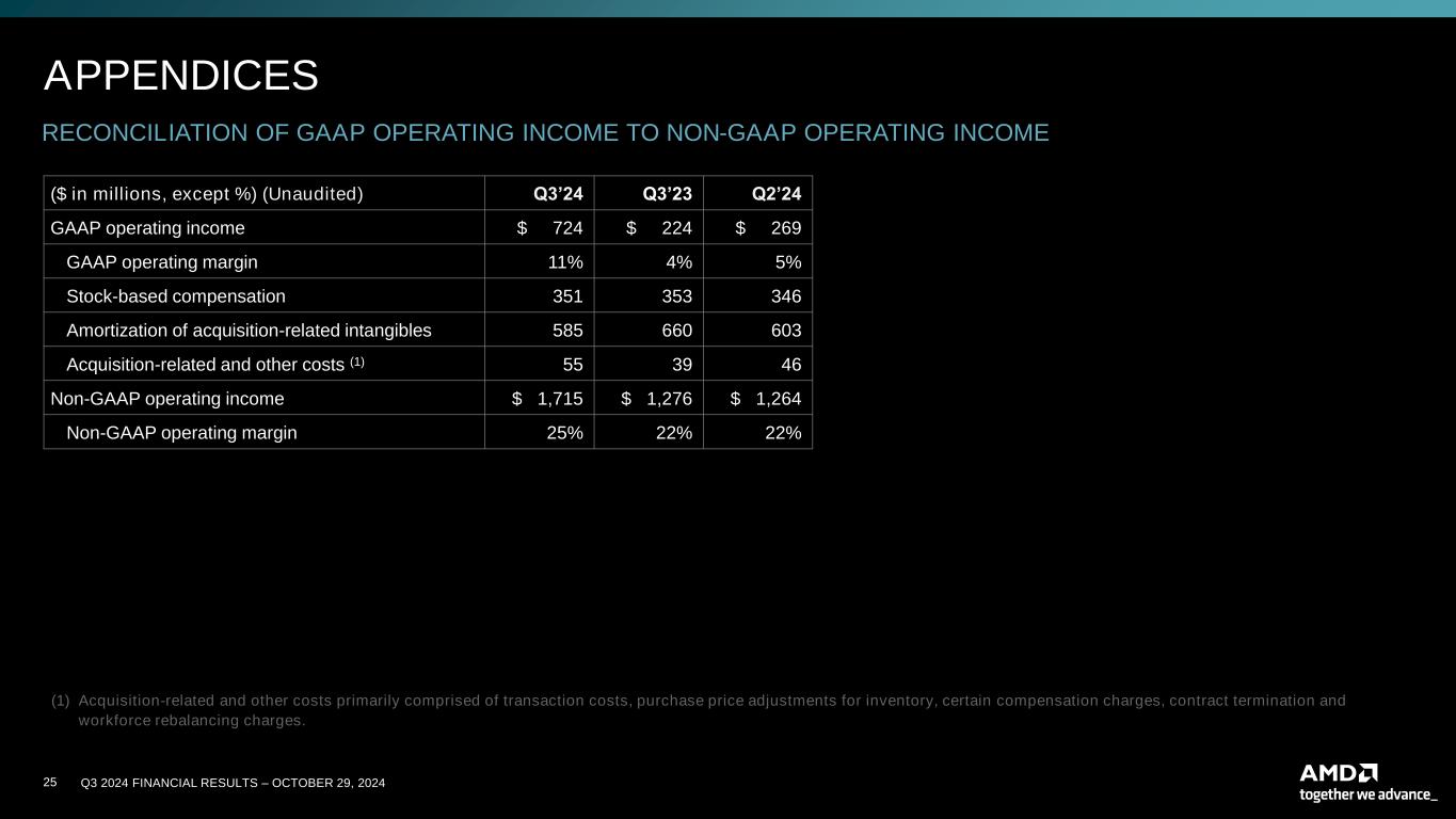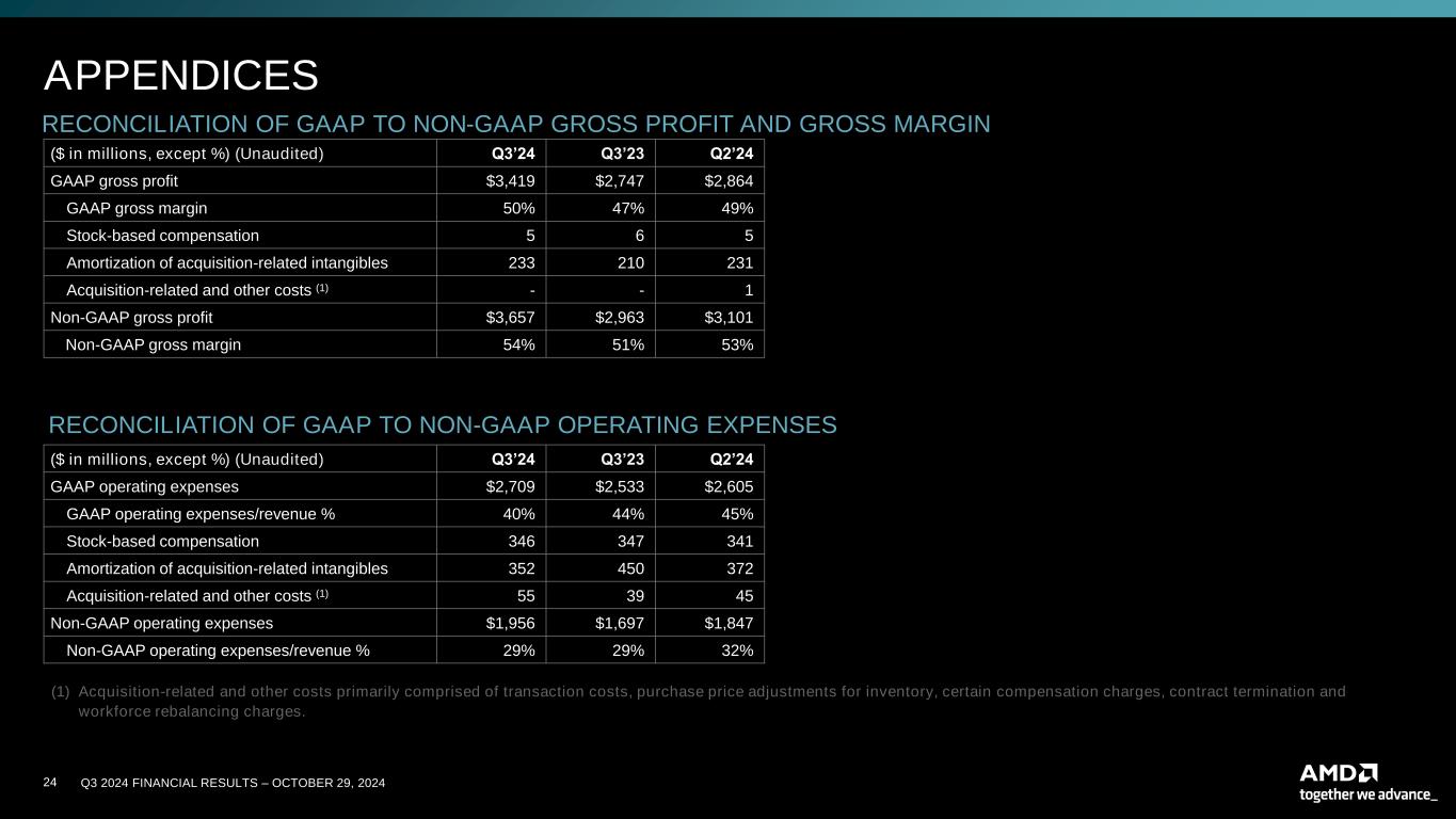 24 Q3 2024 FINANCIAL RESULTS – OCTOBER 29, 2024 RECONCILIATION OF GAAP TO NON-GAAP GROSS PROFIT AND GROSS MARGIN ($ in millions, except %) (Unaudited) Q3’24 Q3’23 Q2’24 GAAP gross profit $3,419 $2,747 $2,864 GAAP gross margin 50% 47% 49% Stock-based compensation 5 6 5 Amortization of acquisition-related intangibles 233 210 231 Acquisition-related and other costs (1) - - 1 Non-GAAP gross profit $3,657 $2,963 $3,101 Non-GAAP gross margin 54% 51% 53% RECONCILIATION OF GAAP TO NON-GAAP OPERATING EXPENSES ($ in millions, except %) (Unaudited) Q3’24 Q3’23 Q2’24 GAAP operating expenses $2,709 $2,533 $2,605 GAAP operating expenses/revenue % 40% 44% 45% Stock-based compensation 346 347 341 Amortization of acquisition-related intangibles 352 450 372 Acquisition-related and other costs (1) 55 39 45 Non-GAAP operating expenses $1,956 $1,697 $1,847 Non-GAAP operating expenses/revenue % 29% 29% 32% APPENDICES (1) Acquisition-related and other costs primarily comprised of transaction costs, purchase price adjustments for inventory, certain compensation charges, contract termination and workforce rebalancing charges.