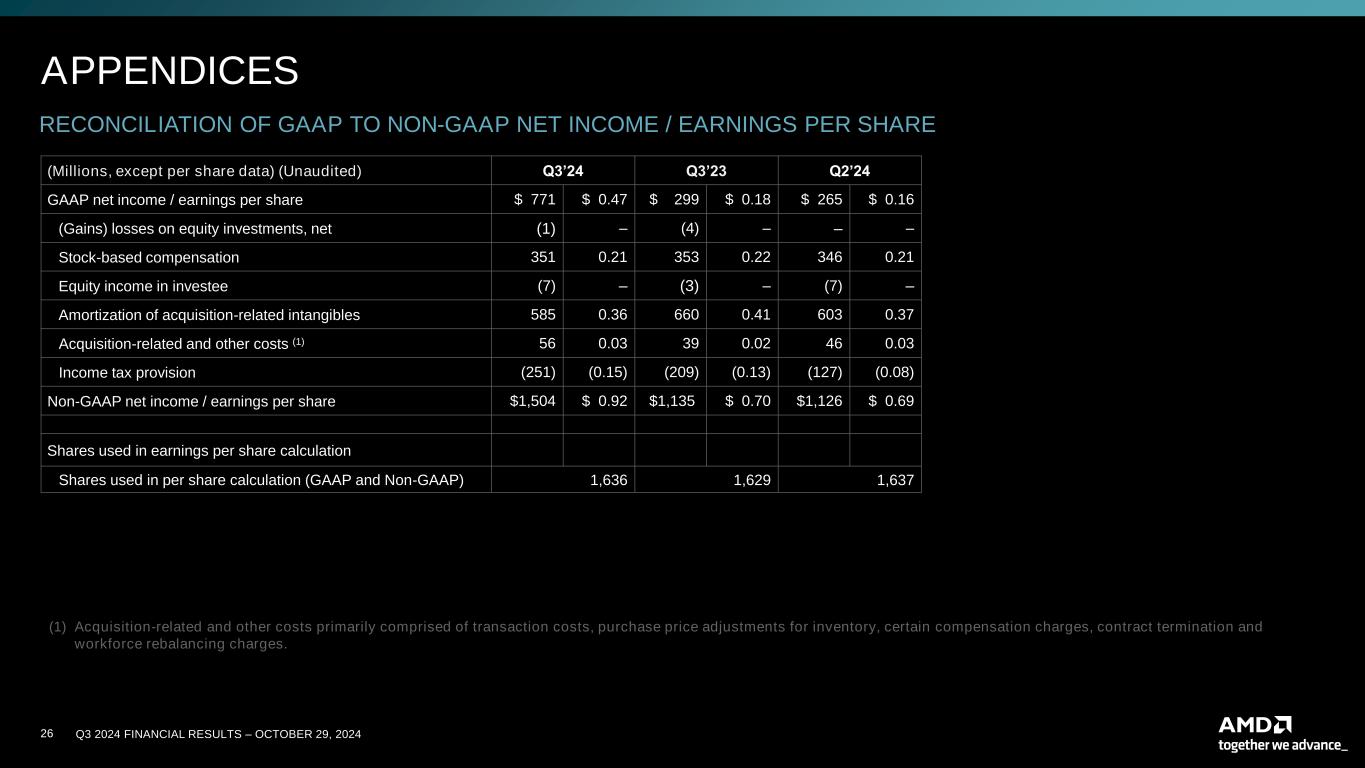 25 Q3 2024 FINANCIAL RESULTS – OCTOBER 29, 2024 APPENDICES RECONCILIATION OF GAAP OPERATING INCOME TO NON-GAAP OPERATING INCOME ($ in millions, except %) (Unaudited) Q3’24 Q3’23 Q2’24 GAAP operating income $ 724 $ 224 $ 269 GAAP operating margin 11% 4% 5% Stock-based compensation 351 353 346 Amortization of acquisition-related intangibles 585 660 603 Acquisition-related and other costs (1) 55 39 46 Non-GAAP operating income $ 1,715 $ 1,276 $ 1,264 Non-GAAP operating margin 25% 22% 22% (1) Acquisition-related and other costs primarily comprised of transaction costs, purchase price adjustments for inventory, certain compensation charges, contract termination and workforce rebalancing charges.