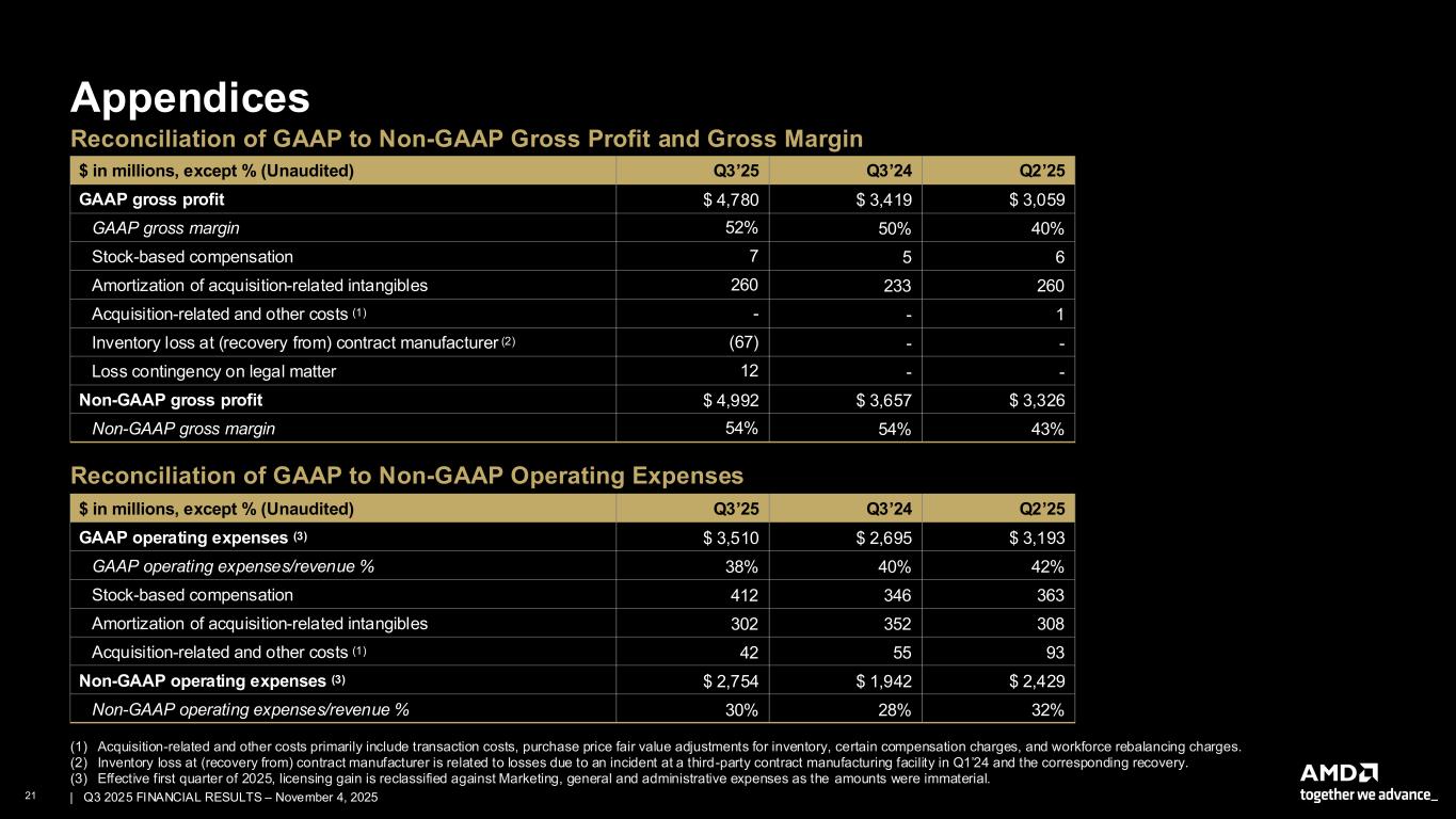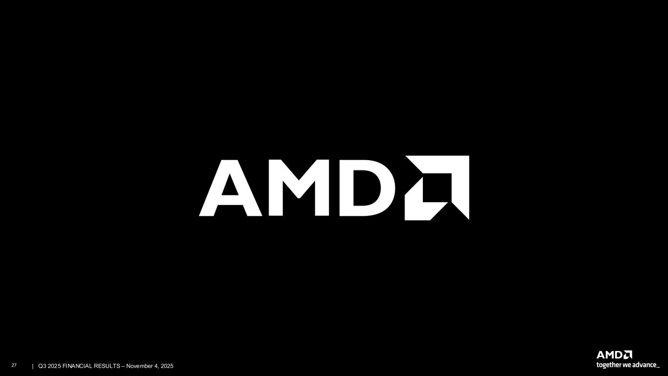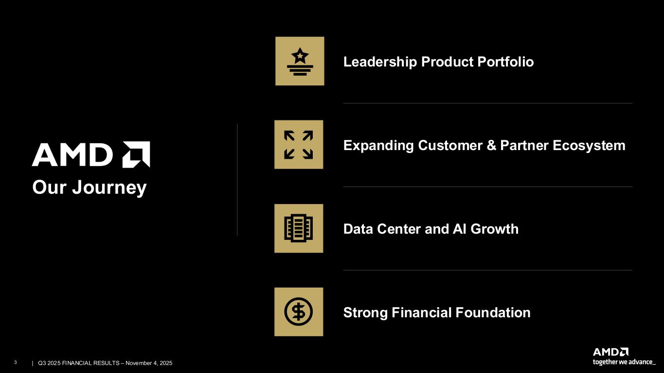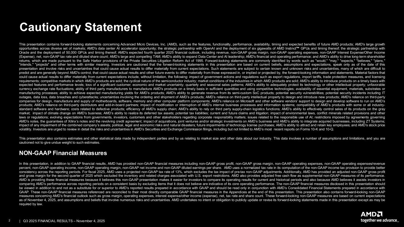 2 | | Q3 2025 FINANCIAL RESULTS – November 4, 2025 Cautionary Statement This presentation contains forward-looking statements concerning Advanced Micro Devices, Inc. (AMD), such as the features, functionality, performance, availability, timing and expected benefits of future AMD products; AMD's large growth opportunities across diverse set of markets; AMD's data center AI accelerator opportunity; the strategic partnership with OpenAI and the deployment of six gigawatts of AMD Instinct GPUs and timing thereof; the strategic partnership with Oracle and the deployment of 50,000 GPUs and timing thereof; AMD's expected fourth quarter 2025 financial outlook, including revenue, non-GAAP gross margin, non-GAAP operating expenses, non-GAAP Interest Expense/Other Income (Expense), net, non-GAAP tax rate and diluted share count; AMD’s large and compelling TAM; AMD’s ability to expand Data Center and AI leadership; AMD's financial and operating performance; and AMD’s ability to drive long-term shareholder returns, which are made pursuant to the Safe Harbor provisions of the Private Securities Litigation Reform Act of 1995. Forward-looking statements are commonly identified by words such as "would," "may," "expects," "believes," "plans," "intends," "projects" and other terms with similar meaning. Investors are cautioned that the forward-looking statements in this presentation are based on current beliefs, assumptions and expectations, speak only as of the date of this presentation and involve risks and uncertainties that could cause actual results to differ materially from current expectations. Such statements are subject to certain known and unknown risks and uncertainties, many of which are difficult to predict and are generally beyond AMD's control, that could cause actual results and other future events to differ materially from those expressed in, or implied or projected by, the forward-looking information and statements. Material factors that could cause actual results to differ materially from current expectations include, without limitation, the following: impact of government actions and regulations such as export regulations, import tariffs, trade protection measures, and licensing requirements; competitive markets in which AMD’s products are sold; the cyclical nature of the semiconductor industry; market conditions of the industries in which AMD products are sold; AMD's ability to introduce products on a timely basis with expected features and performance levels; loss of a significant customer; economic and market uncertainty; quarterly and seasonal sales patterns; AMD's ability to adequately protect its technology or other intellectual property; unfavorable currency exchange rate fluctuations; ability of third party manufacturers to manufacture AMD's products on a timely basis in sufficient quantities and using competitive technologies; availability of essential equipment, materials, substrates or manufacturing processes; ability to achieve expected manufacturing yields for AMD’s products; AMD's ability to generate revenue from its semi-custom SoC products; potential security vulnerabilities; potential security incidents including IT outages, data loss, data breaches and cyberattacks; uncertainties involving the ordering and shipment of AMD’s products; AMD’s reliance on third-party intellectual property to design and introduce new products; AMD's reliance on third-party companies for design, manufacture and supply of motherboards, software, memory and other computer platform components; AMD's reliance on Microsoft and other software vendors' support to design and develop software to run on AMD’s products; AMD’s reliance on third-party distributors and add-in-board partners; impact of modification or interruption of AMD’s internal business processes and information systems; compatibility of AMD’s products with some or all industry- standard software and hardware; costs related to defective products; efficiency of AMD's supply chain; AMD's ability to rely on third party supply-chain logistics functions; AMD’s ability to effectively control sales of its products on the gray market; impact of climate change on AMD’s business; AMD’s ability to realize its deferred tax assets; potential tax liabilities; current and future claims and litigation; impact of environmental laws, conflict minerals related provisions and other laws or regulations; evolving expectations from governments, investors, customers and other stakeholders regarding corporate responsibility matters; issues related to the responsible use of AI; restrictions imposed by agreements governing AMD’s notes, the guarantees of Xilinx’s notes and the revolving credit agreement; impact of acquisitions, joint ventures and/or strategic investments on AMD’s business and AMD’s ability to integrate acquired businesses, including ZT Systems; impact of any impairment of the combined company’s assets; political, legal and economic risks and natural disasters; future impairments of technology license purchases; AMD’s ability to attract and retain key employees; and AMD’s stock price volatility. Investors are urged to review in detail the risks and uncertainties in AMD’s Securities and Exchange Commission filings, including but not limited to AMD’s most recent reports on Forms 10-K and 10-Q. This presentation also contains estimates and other statistical data made by independent parties and by us relating to market size and other data about our industry. This data involves a number of assumptions and limitations, and you are cautioned not to give undue weight to such estimates. NON-GAAP Financial Measures In this presentation, in addition to GAAP financial results, AMD has provided non-GAAP financial measures including non-GAAP gross profit, non-GAAP gross margin, non-GAAP operating expenses, non-GAAP operating expenses/revenue percent, non-GAAP operating income, non-GAAP operating margin, non-GAAP ne