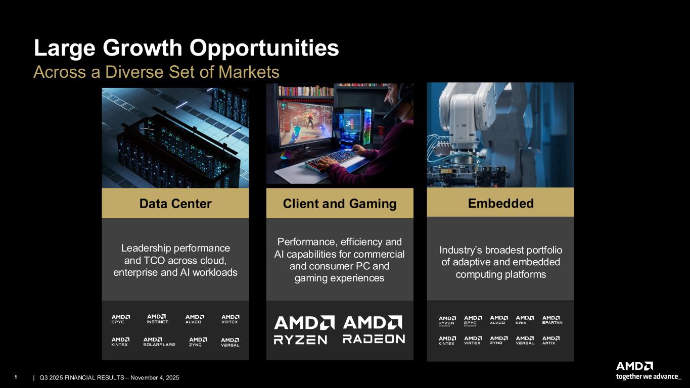 4 | | Q3 2025 FINANCIAL RESULTS – November 4, 2025 High Performance & Adaptive Computing Leadership Accelerating innovation in silicon architecture, advanced packaging and software Scaling compute engines from cloud to edge to endpoints with leadership performance per watt​ Delivering a robust software stack and flexibility, transparency and choice to developers Computing partner of choice across AI, data center, embedded, PCs and gaming Leadership Foundational IP Breadth and Depth of Portfolio Open, Proven Software Ecosystem Deep, Collaborative Partnerships