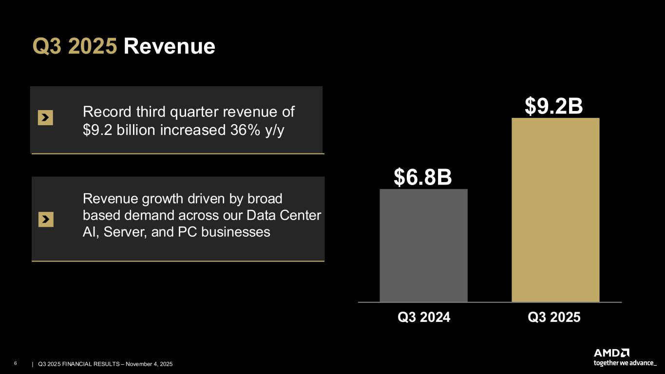 5 | | Q3 2025 FINANCIAL RESULTS – November 4, 2025 Large Growth Opportunities Across a Diverse Set of Markets Embedded Industry’s broadest portfolio of adaptive and embedded computing platforms Data Center Leadership performance and TCO across cloud, enterprise and AI workloads Client and Gaming Performance, efficiency and AI capabilities for commercial and consumer PC and gaming experiences