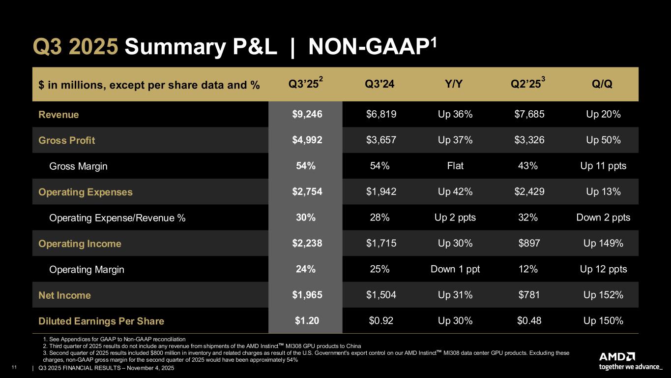 10 | | Q3 2025 FINANCIAL RESULTS – November 4, 2025 Q3 2025 Summary P&L | GAAP $ in millions, except per share data and % Q3’25 1 Q3’24 Y/Y Q2’25 2 Q/Q Revenue $9,246 $6,819 Up 36% $7,685 Up 20% Gross Profit $4,780 $3,419 Up 40% $3,059 Up 56% Gross Margin 52% 50% Up 2 ppts 40% Up 12 ppts Operating Expenses $3,510 $2,695 Up 30% $3,193 Up 10% Operating Expense/Revenue % 38% 40% Down 2 ppts 42% Down 4 ppts Operating Income (Loss) $1,270 $724 Up 75% $(134) Up 1,048% Operating Margin 14% 11% Up 3 ppts (2)% Up 16 ppts Net Income $1,243 $771 Up 61% $872 Up 43% Diluted Earnings Per Share $0.75 $0.47 Up 60% $0.54 Up 39% 1. Third quarter of 2025 results do not include any revenue from shipments of the AMD Instinct MI308 GPU products to China 2. Second quarter of 2025 results included $800 million in inventory and related charges as result of the U.S. Government's export control on our AMD Instinct MI308 data center GPU products.