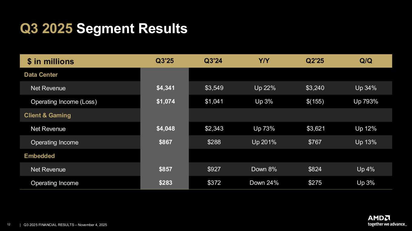 11 | | Q3 2025 FINANCIAL RESULTS – November 4, 2025 Q3 2025 Summary P&L | NON-GAAP1 $ in millions, except per share data and % Q3’25 2 Q3'24 Y/Y Q2’25 3 Q/Q Revenue $9,246 $6,819 Up 36% $7,685 Up 20% Gross Profit $4,992 $3,657 Up 37% $3,326 Up 50% Gross Margin 54% 54% Flat 43% Up 11 ppts Operating Expenses $2,754 $1,942 Up 42% $2,429 Up 13% Operating Expense/Revenue % 30% 28% Up 2 ppts 32% Down 2 ppts Operating Income $2,238 $1,715 Up 30% $897 Up 149% Operating Margin 24% 25% Down 1 ppt 12% Up 12 ppts Net Income $1,965 $1,504 Up 31% $781 Up 152% Diluted Earnings Per Share $1.20 $0.92 Up 30% $0.48 Up 150% 1. See Appendices for GAAP to Non-GAAP reconciliation 2. Third quarter of 2025 results do not include any revenue from shipments of the AMD Instinct MI308 GPU products to China 3. Second quarter of 2025 results included $800 million in inventory and related charges as result of the U.S. Government's export control on our AMD Instinct MI308 data center GPU products. Excluding these charges, non-GAAP gross margin for the second quarter of 2025 would have been approximately 54%