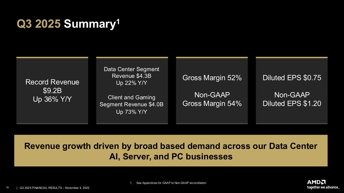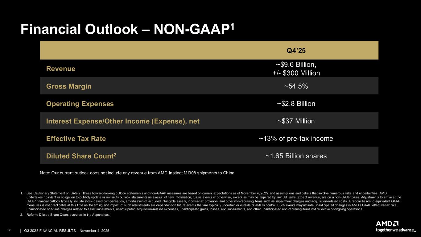 17 | | Q3 2025 FINANCIAL RESULTS – November 4, 2025 Financial Outlook – NON-GAAP1 1. See Cautionary Statement on Slide 2. These forward-looking outlook statements and non-GAAP measures are based on current expectations as of November 4, 2025, and assumptions and beliefs that involve numerous risks and uncertainties. AMD undertakes no intent or obligation to publicly update or revise its outlook statements as a result of new information, future events or otherwise, except as may be required by law. All items, except revenue, are on a non-GAAP basis. Adjustments to arrive at the GAAP financial outlook typically include stock-based compensation, amortization of acquired intangible assets, income tax provision, and other non-recurring items such as impairment charges and acquisition-related costs. A reconciliation to equivalent GAAP measures is not practicable at this time as the timing and impact of such adjustments are dependent on future events that are typically uncertain or outside of AMD's control. Such events may include unanticipated changes in AMD’s GAAP effective tax rate , unanticipated one-time charges related to asset impairments, unanticipated acquisition-related expenses, unanticipated gains, losses, and impairments, and other unanticipated non-recurring items not reflective of ongoing operations. 2. Refer to Diluted Share Count overview in the Appendices. Q4’25 Revenue ~$9.6 Billion, +/- $300 Million Gross Margin ~54.5% Operating Expenses ~$2.8 Billion Interest Expense/Other Income (Expense), net ~$37 Million Effective Tax Rate ~13% of pre-tax income Diluted Share Count2 ~1.65 Billion shares Note: Our current outlook does not include any revenue from AMD Instinct MI308 shipments to China