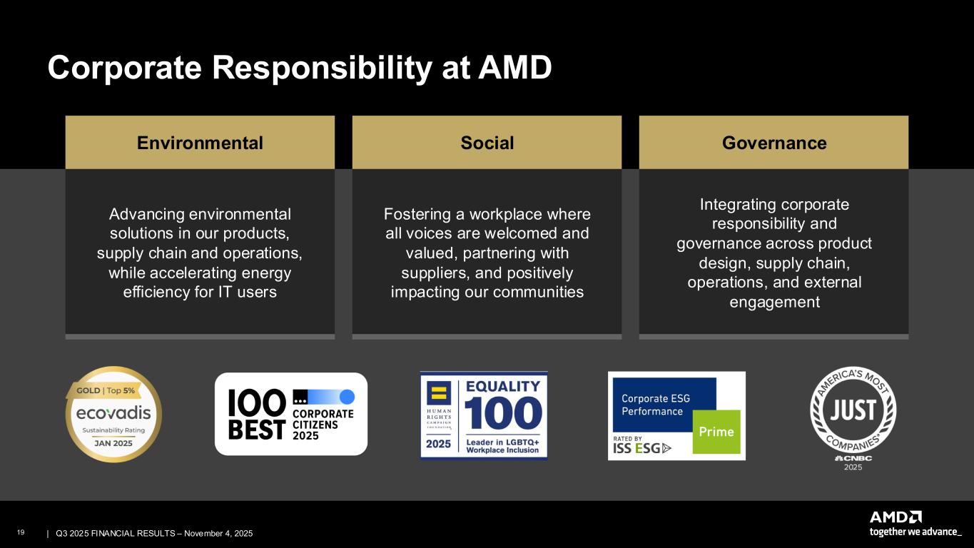 18 | | Q3 2025 FINANCIAL RESULTS – November 4, 2025 Q3 2025 Summary1 1. See Appendices for GAAP to Non-GAAP reconciliation Revenue growth driven by broad based demand across our Data Center AI, Server, and PC businesses Record Revenue $9.2B Up 36% Y/Y Gross Margin 52% Non-GAAP Gross Margin 54% Data Center Segment Revenue $4.3B Up 22% Y/Y Client and Gaming Segment Revenue $4.0B Up 73% Y/Y Diluted EPS $0.75 Non-GAAP Diluted EPS $1.20