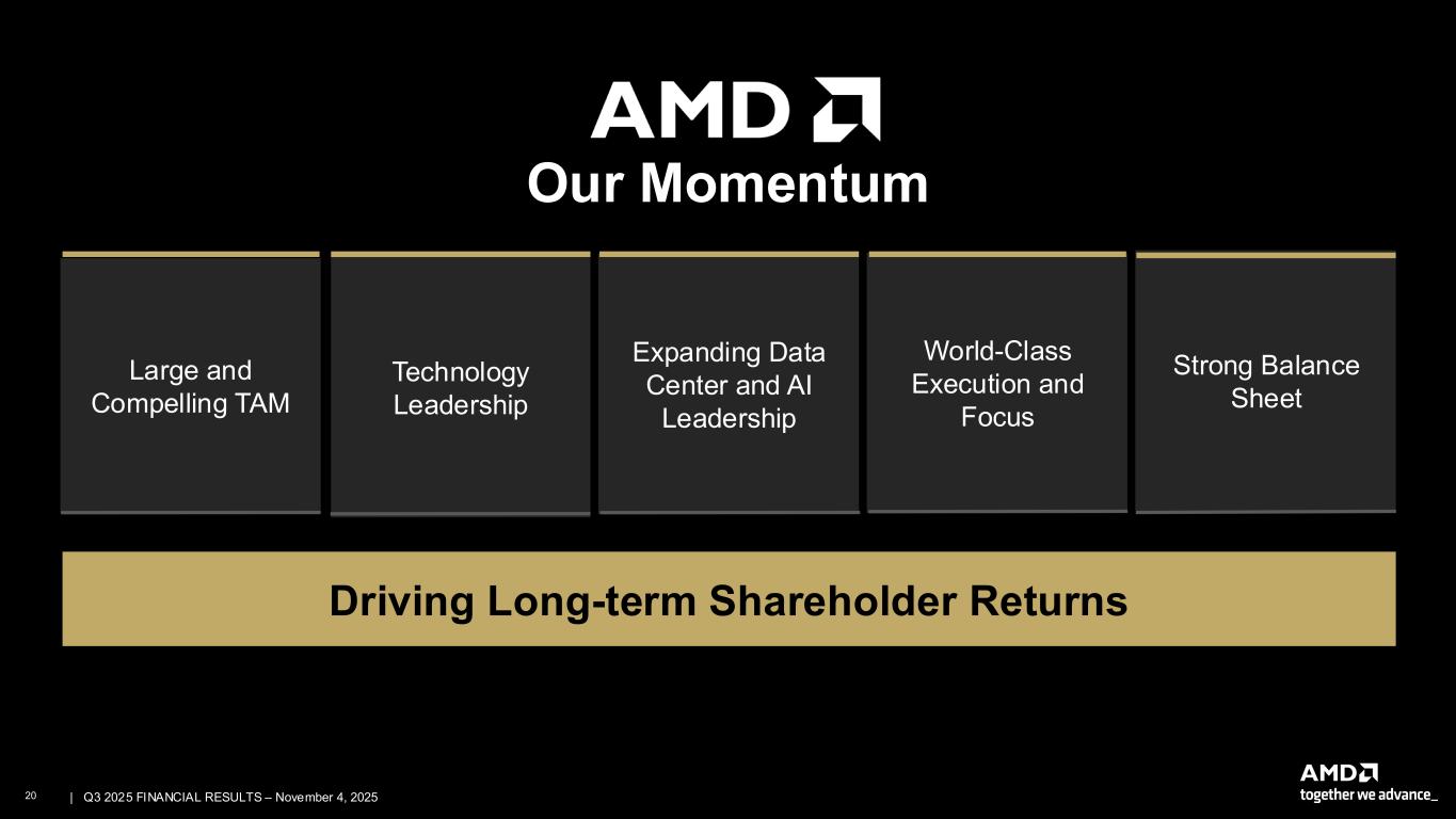 19 | | Q3 2025 FINANCIAL RESULTS – November 4, 2025 Corporate Responsibility at AMD Environmental Advancing environmental solutions in our products, supply chain and operations, while accelerating energy efficiency for IT users Social Fostering a workplace where all voices are welcomed and valued, partnering with suppliers, and positively impacting our communities Governance Integrating corporate responsibility and governance across product design, supply chain, operations, and external engagement