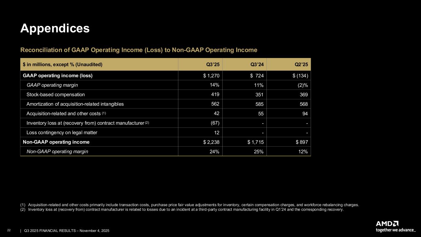 21 | | Q3 2025 FINANCIAL RESULTS – November 4, 2025 Appendices $ in millions, except % (Unaudited) Q3’25 Q3’24 Q2’25 GAAP gross profit $ 4,780 $ 3,419 $ 3,059 GAAP gross margin 52% 50% 40% Stock-based compensation 7 5 6 Amortization of acquisition-related intangibles 260 233 260 Acquisition-related and other costs (1) - - 1 Inventory loss at (recovery from) contract manufacturer (2) (67) - - Loss contingency on legal matter 12 - - Non-GAAP gross profit $ 4,992 $ 3,657 $ 3,326 Non-GAAP gross margin 54% 54% 43% (1) Acquisition-related and other costs primarily include transaction costs, purchase price fair value adjustments for inventory, certain compensation charges, and workforce rebalancing charges. (2) Inventory loss at (recovery from) contract manufacturer is related to losses due to an incident at a third-party contract manufacturing facility in Q1’24 and the corresponding recovery. (3) Effective first quarter of 2025, licensing gain is reclassified against Marketing, general and administrative expenses as the amounts were immaterial. Reconciliation of GAAP to Non-GAAP Gross Profit and Gross Margin $ in millions, except % (Unaudited) Q3’25 Q3’24 Q2’25 GAAP operating expenses (3) $ 3,510 $ 2,695 $ 3,193 GAAP operating expenses/revenue % 38% 40% 42% Stock-based compensation 412 346 363 Amortization of acquisition-related intangibles 302 352 308 Acquisition-related and other costs (1) 42 55 93 Non-GAAP operating expenses (3) $ 2,754 $ 1,942 $ 2,429 Non-GAAP operating expenses/revenue % 30% 28% 32% Reconciliation of GAAP to Non-GAAP Operating Expenses