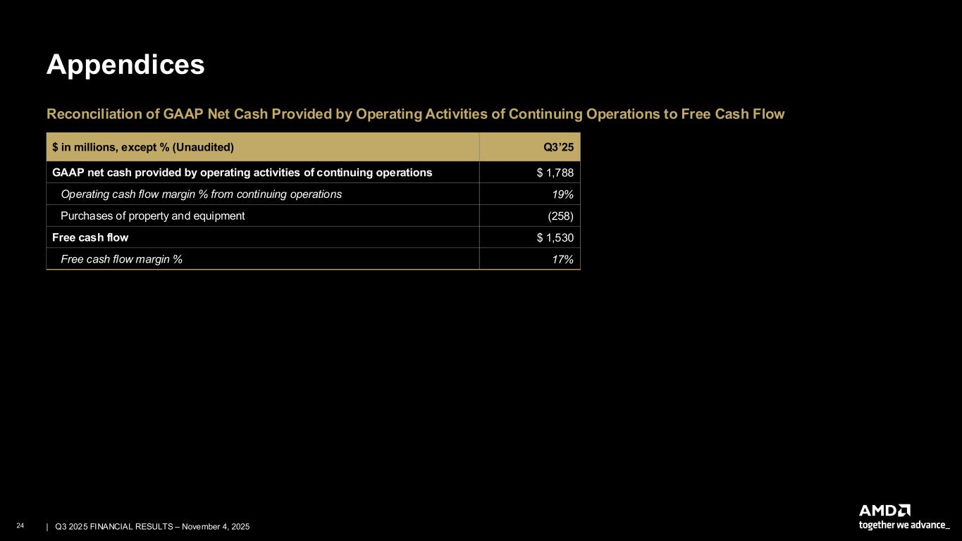 23 | | Q3 2025 FINANCIAL RESULTS – November 4, 2025 Appendices Reconciliation of GAAP to Non-GAAP Net Income / Diluted Earnings Per Share $ in millions, except per share data (Unaudited) Q3’25 Q3’24 Q2’25 GAAP net income / earnings per share $ 1,243 $ 0.75 $ 771 $ 0.47 $ 872 $ 0.54 Stock-based compensation 419 0.26 351 0.21 369 0.23 Amortization of acquisition-related intangibles 562 0.34 585 0.36 568 0.35 Acquisition-related and other costs (1) 43 0.03 56 0.03 96 0.05 Inventory loss at (recovery from) contract manufacturer (2) (67) (0.04) - - - - Loss contingency on legal matter 12 0.01 - - - - (Gains) losses on equity investments, net (26) (0.02) (1) - (61) (0.04) Equity income in investee (10) - (7) - (8) - Release of reserves for uncertain tax positions (3) - - - - (853) (0.52) Income tax provision (140) (0.09) (251) (0.15) (98) (0.06) Income from discontinued operations, net of tax (4) (71) (0.04) - - (104) (0.07) Non-GAAP net income / earnings per share $ 1,965 $ 1.20 $ 1,504 $ 0.92 $ 781 $ 0.48 (1) Acquisition-related and other costs primarily include transaction costs, purchase price fair value adjustments for inventory, certain compensation charges, and workforce rebalancing charges. (2) Inventory loss at (recovery from) contract manufacturer is related to losses due to an incident at a third-party contract manufacturing facility in Q1’24 and the corresponding recovery. (3) Release of reserves for uncertain tax positions pertains to the reasonable cause relief related to dual consolidated losses approved by IRS in Q2'25. (4) Income from discontinued operations is related to ZT Systems' manufacturing business which is classified as held-for-sale.