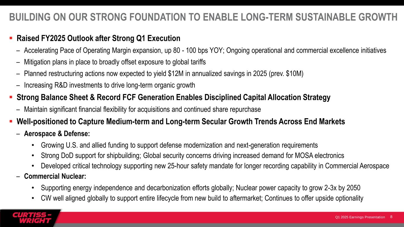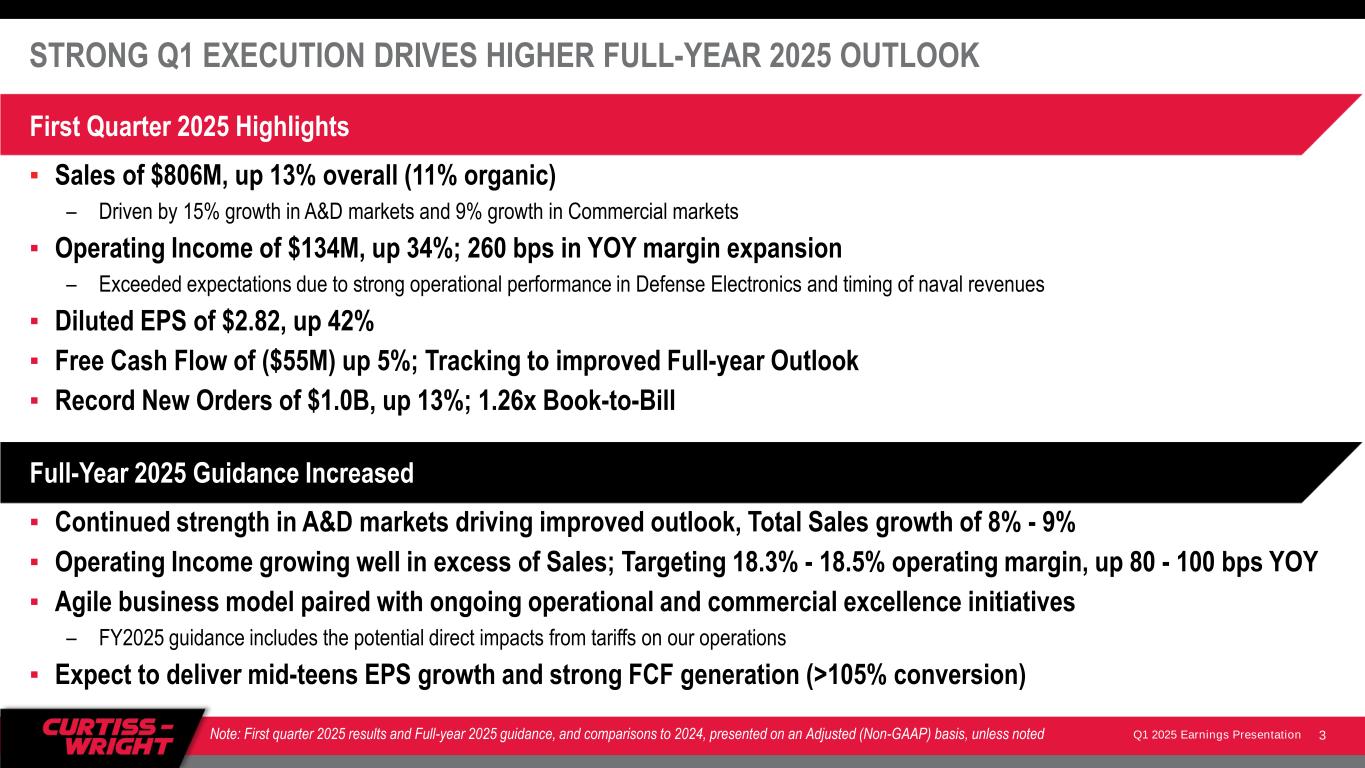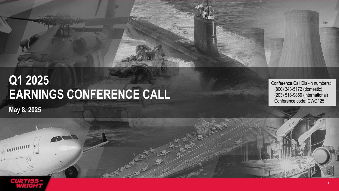 Q1 2025 Earnings Presentation SAFE HARBOR STATEMENT Please note that the information provided in this presentation is accurate as of the date of the original presentation. The presentation will remain posted on this website from one to twelve months following the initial presentation, but content will not be updated to reflect new information that may become available after the original presentation posting. The presentation contains forward-looking statements within the meaning of Section 27A of the Securities Act of 1933, as amended ("Securities Act"), Section 21E of the Securities Exchange Act of 1934, as amended ("Exchange Act"), and the Private Securities Litigation Reform Act of 1995. Such forward-looking statements only speak as of the date of this report and Curtiss-Wright Corporation assumes no obligation to update the information included in this report. Such forward-looking statements are subject to certain risks and uncertainties that could cause actual results to differ materially from those expressed or implied. Readers are cautioned not to place undue reliance on these forward-looking statements, which speak only as of the date hereof. Such risks and uncertainties include but are not limited to: a reduction in anticipated orders; an economic downturn; geopolitical risks; evolving impacts from tariffs between the U.S. and other countries (including implementation of new tariffs and retaliatory measures); changes in the competitive marketplace and/or customer requirements; a change in government spending; an inability to perform customer contracts at anticipated cost levels; and other factors that generally affect the business of aerospace, defense contracting, electronics, marine, and industrial companies. This presentation also includes certain non-GAAP financial measures with reconciliations to GAAP financial measures being made available in the earnings release and this presentation that are posted to our website and furnished with the SEC. We undertake no duty to update this information. More information about potential factors that could affect our business and financial results is included in our filings with the Securities and Exchange Commission, including our Annual Reports on Form 10-K and Quarterly Reports on Form 10-Q, including, among other sections, under the captions, "Risk Factors" and "Management's Discussion and Analysis of Financial Condition and Results of Operations," which is on file with the SEC and available at the SEC's website at www.sec.gov. 2