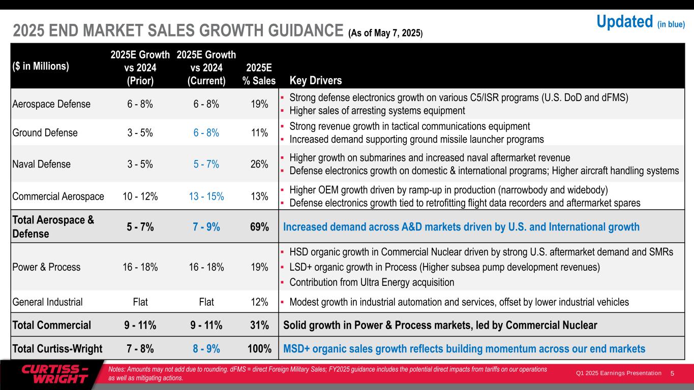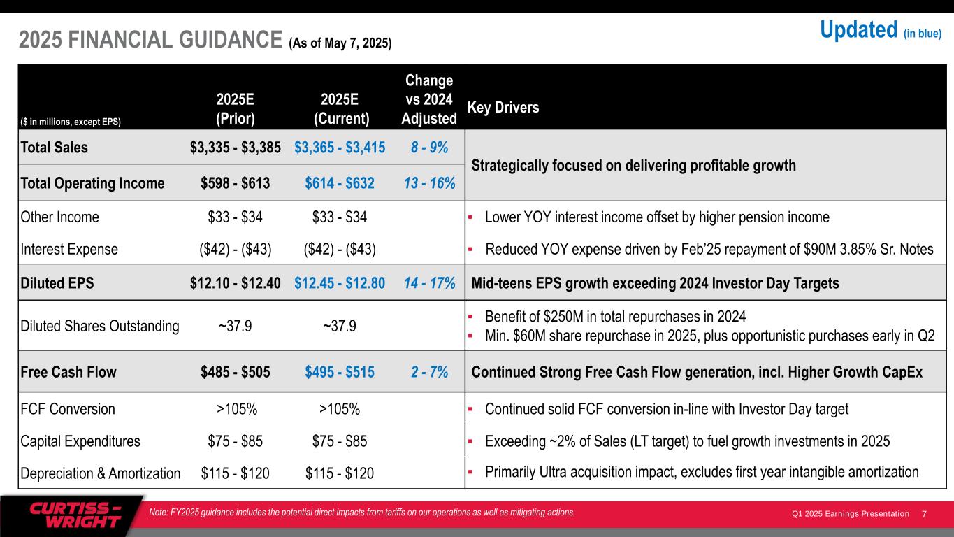Q1 2025 Earnings Presentation ($ in millions) 2025E (Prior) 2025E (Current) Change vs 2024 Adjusted Key Drivers Aerospace & Industrial $960 - $975 $960 - $975 3 - 5% ▪ Strong growth in Commercial Aerospace and higher EM actuation sales in Defense markets ▪ Flat General Industrial sales Defense Electronics $975 - $990 $995 - $1,010 9 - 11% ▪ Defense market growth (U.S. DoD and dFMS) driven by increased embedded computing and tactical communications revenues ▪ Commercial Aerospace growth reflects increased sales of avionics and instrumentation Naval & Power $1,400 - $1,420 $1,410 - $1,430 10 - 12% ▪ Strong growth in Power & Process; HSD organic growth in Commercial Nuclear, solid growth in Process and Ultra Energy acquisition ▪ Solid Naval Defense growth; Higher dFMS (aircraft handling & arresting systems) Total Sales $3,335 - $3,385 $3,365 - $3,415 8 - 9% Benefiting from continued growth in order book and strong backlog Aerospace & Industrial Margin $167 - $172 17.4% - 17.6% $163 - $172 17.0% - 17.6% 3 - 8% 0 - 60 bps ▪ Favorable absorption on strong growth in A&D revenues and restructuring savings ▪ Mitigating tariff exposure (mainly China) through pricing and operational excellence Defense Electronics Margin $244 - $250 25.0% - 25.2% $261 - $267 26.3% - 26.5% 15 - 18% 140 - 160 bps ▪ Favorable absorption on strong growth in A&D revenues ▪ Benefit of operational and commercial excellence initiatives; Additional restructuring savings ▪ Profitability partially offset by higher investments in R&D Naval & Power Margin $228 - $234 16.3% - 16.5% $229 - $236 16.3% - 16.5% 14 - 17% 50 - 70 bps ▪ Favorable absorption on higher A&D and Power & Process revenues; PY naval contract adjustment ▪ Profitability partially offset by first-year acquisition dilution and investment in development programs ▪ Effectively mitigating tariff exposure (mainly China) through pricing and operational excellence Corporate and Other ($40) - ($42) ($40) - ($42) (3%) - 3% Total Op. Income CW Margin $598 - $613 17.9% - 18.1% $614 - $632 18.3% - 18.5% 13 - 16% 80 - 100 bps Operational and Commercial Excellence Initiatives Driving Accelerated Operating Margin Expansion In 2025 2025 FINANCIAL GUIDANCE (As of May 7, 2025) 6 Updated (in blue) Notes: Amounts may not add due to rounding. dFMS = direct Foreign Military Sales; FY2025 guidance includes the potential direct impacts from tariffs on our operations as well as mitigating actions.