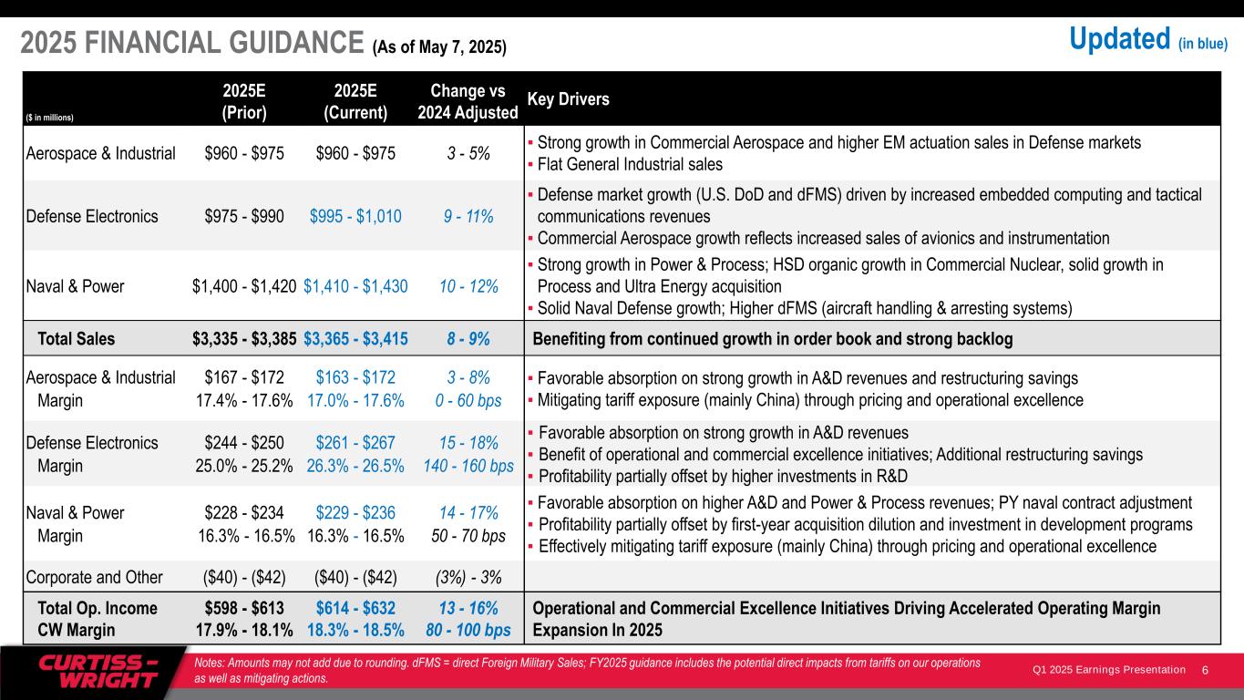 Q1 2025 Earnings Presentation 2025 END MARKET SALES GROWTH GUIDANCE (As of May 7, 2025) ($ in Millions) 2025E Growth vs 2024 (Prior) 2025E Growth vs 2024 (Current) 2025E % Sales Key Drivers Aerospace Defense 6 - 8% 6 - 8% 19% ▪ Strong defense electronics growth on various C5/ISR programs (U.S. DoD and dFMS) ▪ Higher sales of arresting systems equipment Ground Defense 3 - 5% 6 - 8% 11% ▪ Strong revenue growth in tactical communications equipment ▪ Increased demand supporting ground missile launcher programs Naval Defense 3 - 5% 5 - 7% 26% ▪ Higher growth on submarines and increased naval aftermarket revenue ▪ Defense electronics growth on domestic & international programs; Higher aircraft handling systems Commercial Aerospace 10 - 12% 13 - 15% 13% ▪ Higher OEM growth driven by ramp-up in production (narrowbody and widebody) ▪ Defense electronics growth tied to retrofitting flight data recorders and aftermarket spares Total Aerospace & Defense 5 - 7% 7 - 9% 69% Increased demand across A&D markets driven by U.S. and International growth Power & Process 16 - 18% 16 - 18% 19% ▪ HSD organic growth in Commercial Nuclear driven by strong U.S. aftermarket demand and SMRs ▪ LSD+ organic growth in Process (Higher subsea pump development revenues) ▪ Contribution from Ultra Energy acquisition General Industrial Flat Flat 12% ▪ Modest growth in industrial automation and services, offset by lower industrial vehicles Total Commercial 9 - 11% 9 - 11% 31% Solid growth in Power & Process markets, led by Commercial Nuclear Total Curtiss-Wright 7 - 8% 8 - 9% 100% MSD+ organic sales growth reflects building momentum across our end markets 5 Notes: Amounts may not add due to rounding. dFMS = direct Foreign Military Sales; FY2025 guidance includes the potential direct impacts from tariffs on our operations as well as mitigating actions. Updated (in blue)
