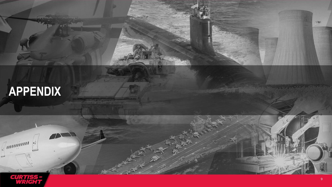 Q1 2025 Earnings Presentation BUILDING ON OUR STRONG FOUNDATION TO ENABLE LONG-TERM SUSTAINABLE GROWTH ▪ Raised FY2025 Outlook after Strong Q1 Execution – Accelerating Pace of Operating Margin expansion, up 80 - 100 bps YOY; Ongoing operational and commercial excellence initiatives – Mitigation plans in place to broadly offset exposure to global tariffs – Planned restructuring actions now expected to yield $12M in annualized savings in 2025 (prev. $10M) – Increasing R&D investments to drive long-term organic growth ▪ Strong Balance Sheet & Record FCF Generation Enables Disciplined Capital Allocation Strategy – Maintain significant financial flexibility for acquisitions and continued share repurchase ▪ Well-positioned to Capture Medium-term and Long-term Secular Growth Trends Across End Markets – Aerospace & Defense: • Growing U.S. and allied funding to support defense modernization and next-generation requirements • Strong DoD support for shipbuilding; Global security concerns driving increased demand for MOSA electronics • Developed critical technology supporting new 25-hour safety mandate for longer recording capability in Commercial Aerospace – Commercial Nuclear: • Supporting energy independence and decarbonization efforts globally; Nuclear power capacity to grow 2-3x by 2050 • CW well aligned globally to support entire lifecycle from new build to aftermarket; Continues to offer upside optionality 8
