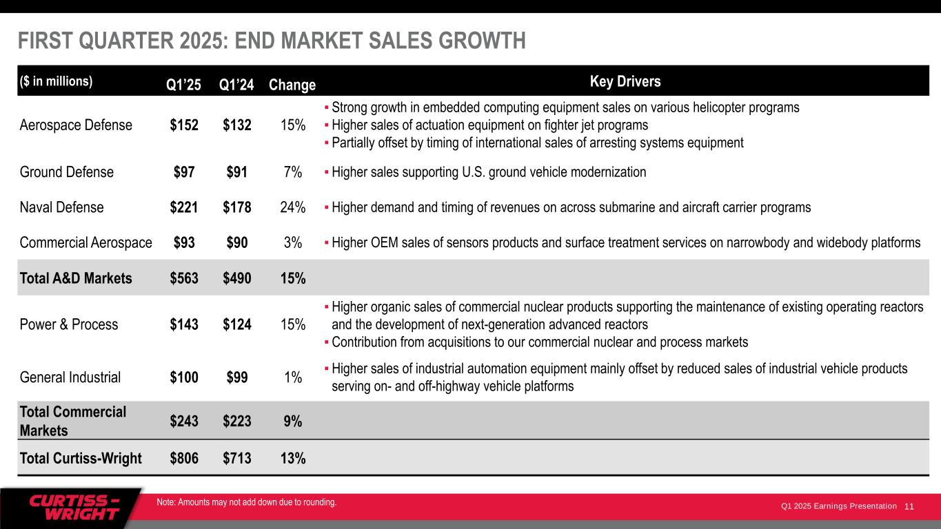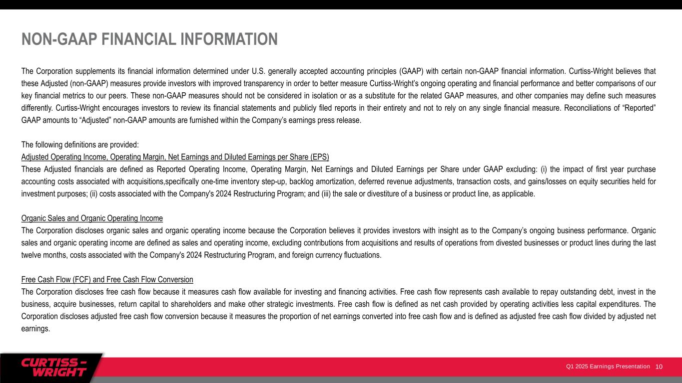 Q1 2025 Earnings Presentation NON-GAAP FINANCIAL INFORMATION The Corporation supplements its financial information determined under U.S. generally accepted accounting principles (GAAP) with certain non-GAAP financial information. Curtiss-Wright believes that these Adjusted (non-GAAP) measures provide investors with improved transparency in order to better measure Curtiss-Wright’s ongoing operating and financial performance and better comparisons of our key financial metrics to our peers. These non-GAAP measures should not be considered in isolation or as a substitute for the related GAAP measures, and other companies may define such measures differently. Curtiss-Wright encourages investors to review its financial statements and publicly filed reports in their entirety and not to rely on any single financial measure. Reconciliations of “Reported” GAAP amounts to “Adjusted” non-GAAP amounts are furnished within the Company’s earnings press release. The following definitions are provided: Adjusted Operating Income, Operating Margin, Net Earnings and Diluted Earnings per Share (EPS) These Adjusted financials are defined as Reported Operating Income, Operating Margin, Net Earnings and Diluted Earnings per Share under GAAP excluding: (i) the impact of first year purchase accounting costs associated with acquisitions,specifically one-time inventory step-up, backlog amortization, deferred revenue adjustments, transaction costs, and gains/losses on equity securities held for investment purposes; (ii) costs associated with the Company's 2024 Restructuring Program; and (iii) the sale or divestiture of a business or product line, as applicable. Organic Sales and Organic Operating Income The Corporation discloses organic sales and organic operating income because the Corporation believes it provides investors with insight as to the Company’s ongoing business performance. Organic sales and organic operating income are defined as sales and operating income, excluding contributions from acquisitions and results of operations from divested businesses or product lines during the last twelve months, costs associated with the Company's 2024 Restructuring Program, and foreign currency fluctuations. Free Cash Flow (FCF) and Free Cash Flow Conversion The Corporation discloses free cash flow because it measures cash flow available for investing and financing activities. Free cash flow represents cash available to repay outstanding debt, invest in the business, acquire businesses, return capital to shareholders and make other strategic investments. Free cash flow is defined as net cash provided by operating activities less capital expenditures. The Corporation discloses adjusted free cash flow conversion because it measures the proportion of net earnings converted into free cash flow and is defined as adjusted free cash flow divided by adjusted net earnings. 10