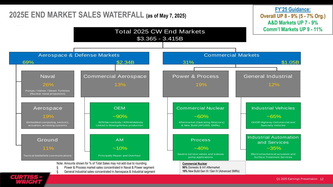 Q1 2025 Earnings Presentation FIRST QUARTER 2025: END MARKET SALES GROWTH ($ in millions) Q1’25 Q1’24 Change Key Drivers Aerospace Defense $152 $132 15% ▪ Strong growth in embedded computing equipment sales on various helicopter programs ▪ Higher sales of actuation equipment on fighter jet programs ▪ Partially offset by timing of international sales of arresting systems equipment Ground Defense $97 $91 7% ▪ Higher sales supporting U.S. ground vehicle modernization Naval Defense $221 $178 24% ▪ Higher demand and timing of revenues on across submarine and aircraft carrier programs Commercial Aerospace $93 $90 3% ▪ Higher OEM sales of sensors products and surface treatment services on narrowbody and widebody platforms Total A&D Markets $563 $490 15% Power & Process $143 $124 15% ▪ Higher organic sales of commercial nuclear products supporting the maintenance of existing operating reactors and the development of next-generation advanced reactors ▪ Contribution from acquisitions to our commercial nuclear and process markets General Industrial $100 $99 1% ▪ Higher sales of industrial automation equipment mainly offset by reduced sales of industrial vehicle products serving on- and off-highway vehicle platforms Total Commercial Markets $243 $223 9% Total Curtiss-Wright $806 $713 13% 11 Note: Amounts may not add down due to rounding.