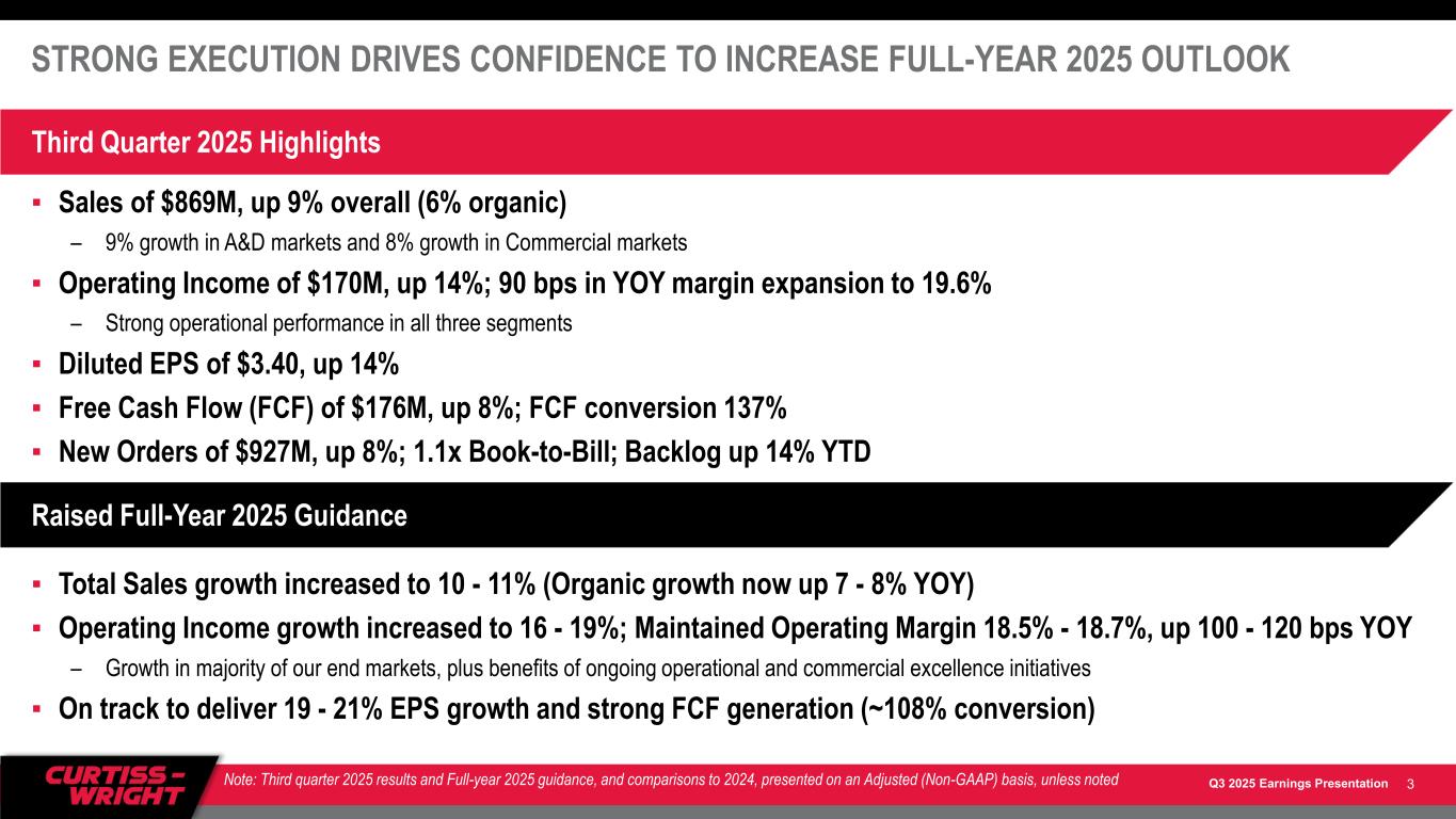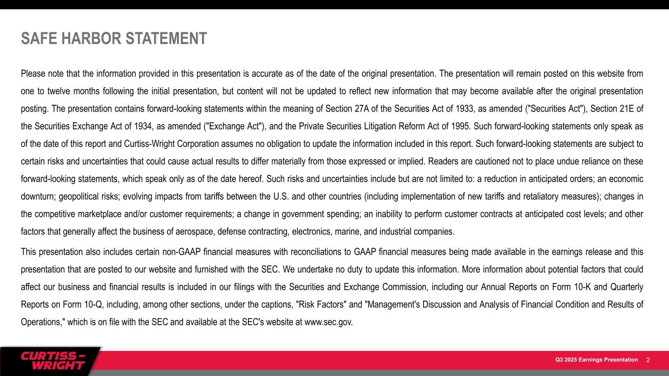 Q3 2025 Earnings Presentation SAFE HARBOR STATEMENT Please note that the information provided in this presentation is accurate as of the date of the original presentation. The presentation will remain posted on this website from one to twelve months following the initial presentation, but content will not be updated to reflect new information that may become available after the original presentation posting. The presentation contains forward-looking statements within the meaning of Section 27A of the Securities Act of 1933, as amended ("Securities Act"), Section 21E of the Securities Exchange Act of 1934, as amended ("Exchange Act"), and the Private Securities Litigation Reform Act of 1995. Such forward-looking statements only speak as of the date of this report and Curtiss-Wright Corporation assumes no obligation to update the information included in this report. Such forward-looking statements are subject to certain risks and uncertainties that could cause actual results to differ materially from those expressed or implied. Readers are cautioned not to place undue reliance on these forward-looking statements, which speak only as of the date hereof. Such risks and uncertainties include but are not limited to: a reduction in anticipated orders; an economic downturn; geopolitical risks; evolving impacts from tariffs between the U.S. and other countries (including implementation of new tariffs and retaliatory measures); changes in the competitive marketplace and/or customer requirements; a change in government spending; an inability to perform customer contracts at anticipated cost levels; and other factors that generally affect the business of aerospace, defense contracting, electronics, marine, and industrial companies. This presentation also includes certain non-GAAP financial measures with reconciliations to GAAP financial measures being made available in the earnings release and this presentation that are posted to our website and furnished with the SEC. We undertake no duty to update this information. More information about potential factors that could affect our business and financial results is included in our filings with the Securities and Exchange Commission, including our Annual Reports on Form 10-K and Quarterly Reports on Form 10-Q, including, among other sections, under the captions, "Risk Factors" and "Management's Discussion and Analysis of Financial Condition and Results of Operations," which is on file with the SEC and available at the SEC's website at www.sec.gov. 2