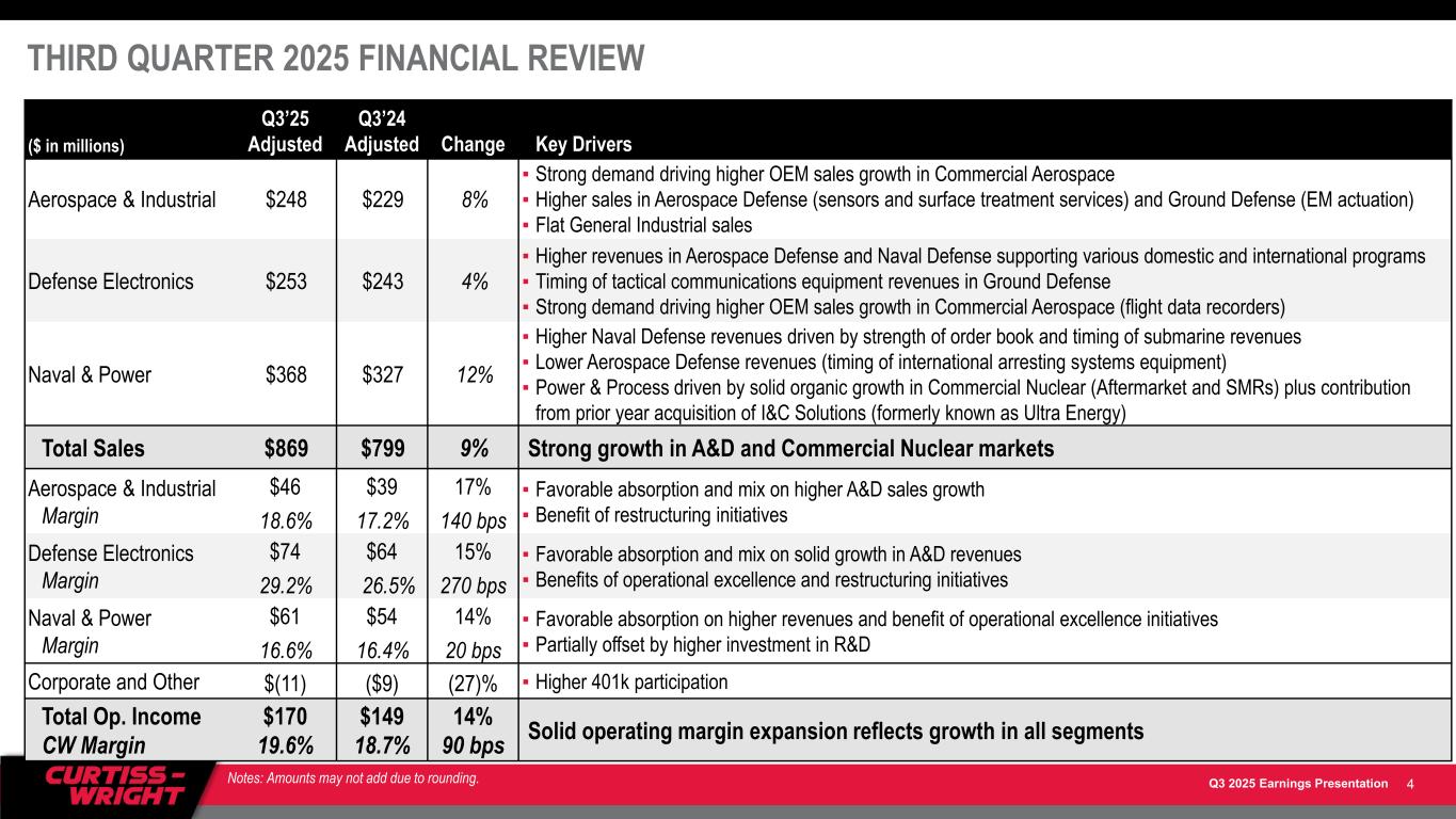 Q3 2025 Earnings Presentation ▪ Sales of $869M, up 9% overall (6% organic) – 9% growth in A&D markets and 8% growth in Commercial markets ▪ Operating Income of $170M, up 14%; 90 bps in YOY margin expansion to 19.6% – Strong operational performance in all three segments ▪ Diluted EPS of $3.40, up 14% ▪ Free Cash Flow (FCF) of $176M, up 8%; FCF conversion 137% ▪ New Orders of $927M, up 8%; 1.1x Book-to-Bill; Backlog up 14% YTD STRONG EXECUTION DRIVES CONFIDENCE TO INCREASE FULL-YEAR 2025 OUTLOOK ▪ Total Sales growth increased to 10 - 11% (Organic growth now up 7 - 8% YOY) ▪ Operating Income growth increased to 16 - 19%; Maintained Operating Margin 18.5% - 18.7%, up 100 - 120 bps YOY – Growth in majority of our end markets, plus benefits of ongoing operational and commercial excellence initiatives ▪ On track to deliver 19 - 21% EPS growth and strong FCF generation (~108% conversion) 3 Third Quarter 2025 Highlights Note: Third quarter 2025 results and Full-year 2025 guidance, and comparisons to 2024, presented on an Adjusted (Non-GAAP) basis, unless noted Raised Full-Year 2025 Guidance