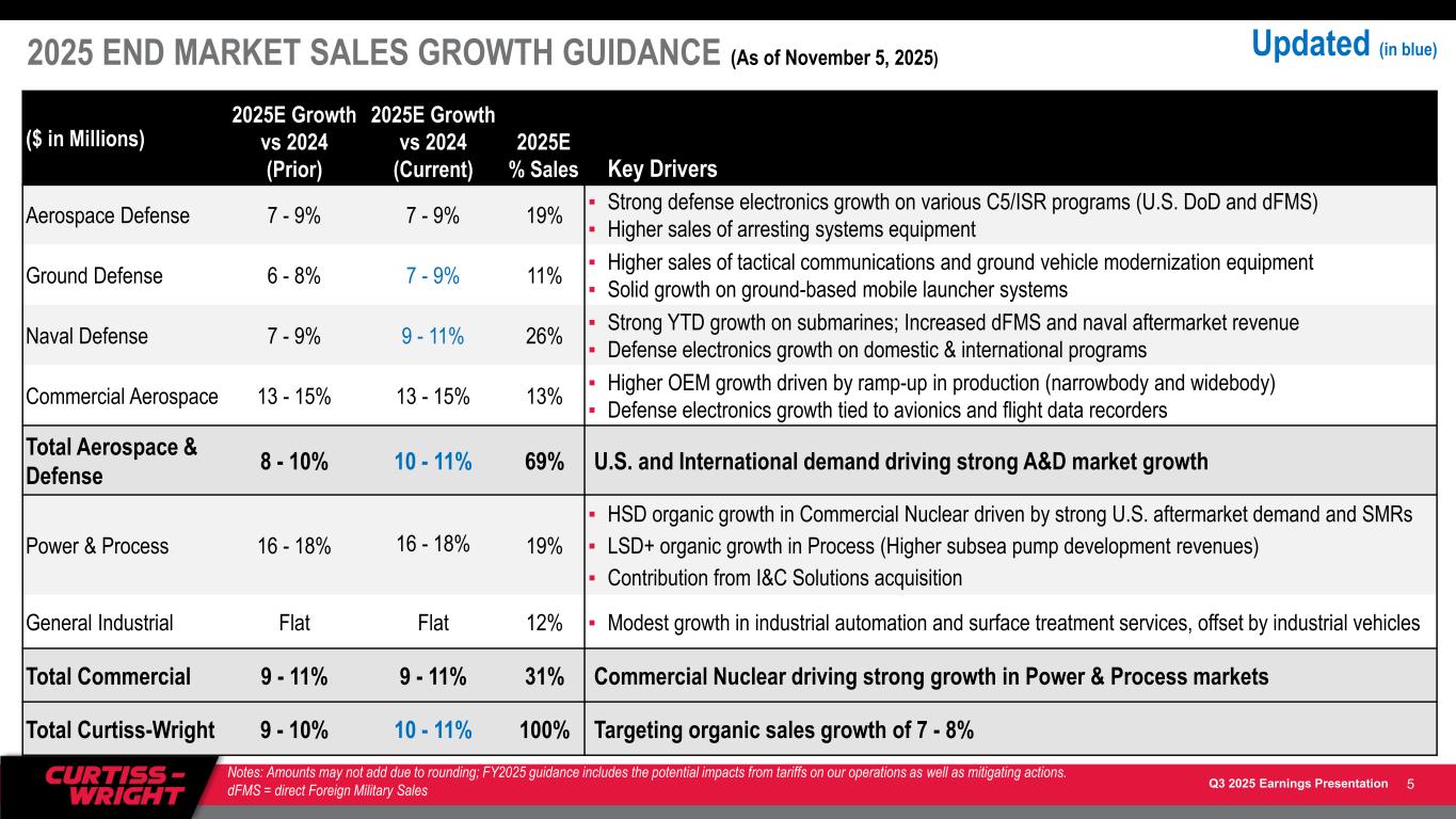 Q3 2025 Earnings Presentation THIRD QUARTER 2025 FINANCIAL REVIEW ($ in millions) Q3’25 Adjusted Q3’24 Adjusted Change Key Drivers Aerospace & Industrial $248 $229 8% ▪ Strong demand driving higher OEM sales growth in Commercial Aerospace ▪ Higher sales in Aerospace Defense (sensors and surface treatment services) and Ground Defense (EM actuation) ▪ Flat General Industrial sales Defense Electronics $253 $243 4% ▪ Higher revenues in Aerospace Defense and Naval Defense supporting various domestic and international programs ▪ Timing of tactical communications equipment revenues in Ground Defense ▪ Strong demand driving higher OEM sales growth in Commercial Aerospace (flight data recorders) Naval & Power $368 $327 12% ▪ Higher Naval Defense revenues driven by strength of order book and timing of submarine revenues ▪ Lower Aerospace Defense revenues (timing of international arresting systems equipment) ▪ Power & Process driven by solid organic growth in Commercial Nuclear (Aftermarket and SMRs) plus contribution from prior year acquisition of I&C Solutions (formerly known as Ultra Energy) Total Sales $869 $799 9% Strong growth in A&D and Commercial Nuclear markets Aerospace & Industrial Margin $46 18.6% $39 17.2% 17% 140 bps ▪ Favorable absorption and mix on higher A&D sales growth ▪ Benefit of restructuring initiatives Defense Electronics Margin $74 29.2% $64 26.5% 15% 270 bps ▪ Favorable absorption and mix on solid growth in A&D revenues ▪ Benefits of operational excellence and restructuring initiatives Naval & Power Margin $61 16.6% $54 16.4% 14% 20 bps ▪ Favorable absorption on higher revenues and benefit of operational excellence initiatives ▪ Partially offset by higher investment in R&D Corporate and Other $(11) ($9) (27)% ▪ Higher 401k participation Total Op. Income CW Margin $170 19.6% $149 18.7% 14% 90 bps Solid operating margin expansion reflects growth in all segments 4Notes: Amounts may not add due to rounding.