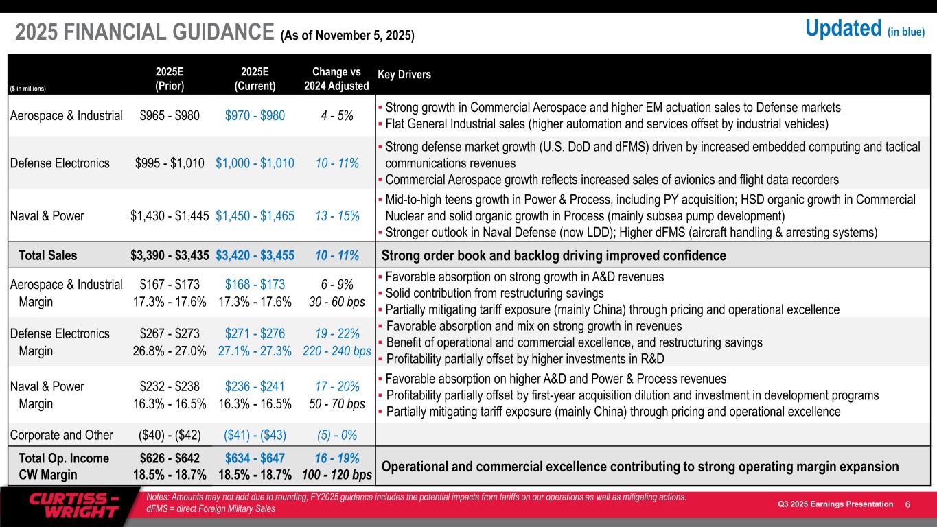 Q3 2025 Earnings Presentation 2025 END MARKET SALES GROWTH GUIDANCE (As of November 5, 2025) ($ in Millions) 2025E Growth vs 2024 (Prior) 2025E Growth vs 2024 (Current) 2025E % Sales Key Drivers Aerospace Defense 7 - 9% 7 - 9% 19% ▪ Strong defense electronics growth on various C5/ISR programs (U.S. DoD and dFMS) ▪ Higher sales of arresting systems equipment Ground Defense 6 - 8% 7 - 9% 11% ▪ Higher sales of tactical communications and ground vehicle modernization equipment ▪ Solid growth on ground-based mobile launcher systems Naval Defense 7 - 9% 9 - 11% 26% ▪ Strong YTD growth on submarines; Increased dFMS and naval aftermarket revenue ▪ Defense electronics growth on domestic & international programs Commercial Aerospace 13 - 15% 13 - 15% 13% ▪ Higher OEM growth driven by ramp-up in production (narrowbody and widebody) ▪ Defense electronics growth tied to avionics and flight data recorders Total Aerospace & Defense 8 - 10% 10 - 11% 69% U.S. and International demand driving strong A&D market growth Power & Process 16 - 18% 16 - 18% 19% ▪ HSD organic growth in Commercial Nuclear driven by strong U.S. aftermarket demand and SMRs ▪ LSD+ organic growth in Process (Higher subsea pump development revenues) ▪ Contribution from I&C Solutions acquisition General Industrial Flat Flat 12% ▪ Modest growth in industrial automation and surface treatment services, offset by industrial vehicles Total Commercial 9 - 11% 9 - 11% 31% Commercial Nuclear driving strong growth in Power & Process markets Total Curtiss-Wright 9 - 10% 10 - 11% 100% Targeting organic sales growth of 7 - 8% 5 Notes: Amounts may not add due to rounding; FY2025 guidance includes the potential impacts from tariffs on our operations as well as mitigating actions. dFMS = direct Foreign Military Sales Updated (in blue)
