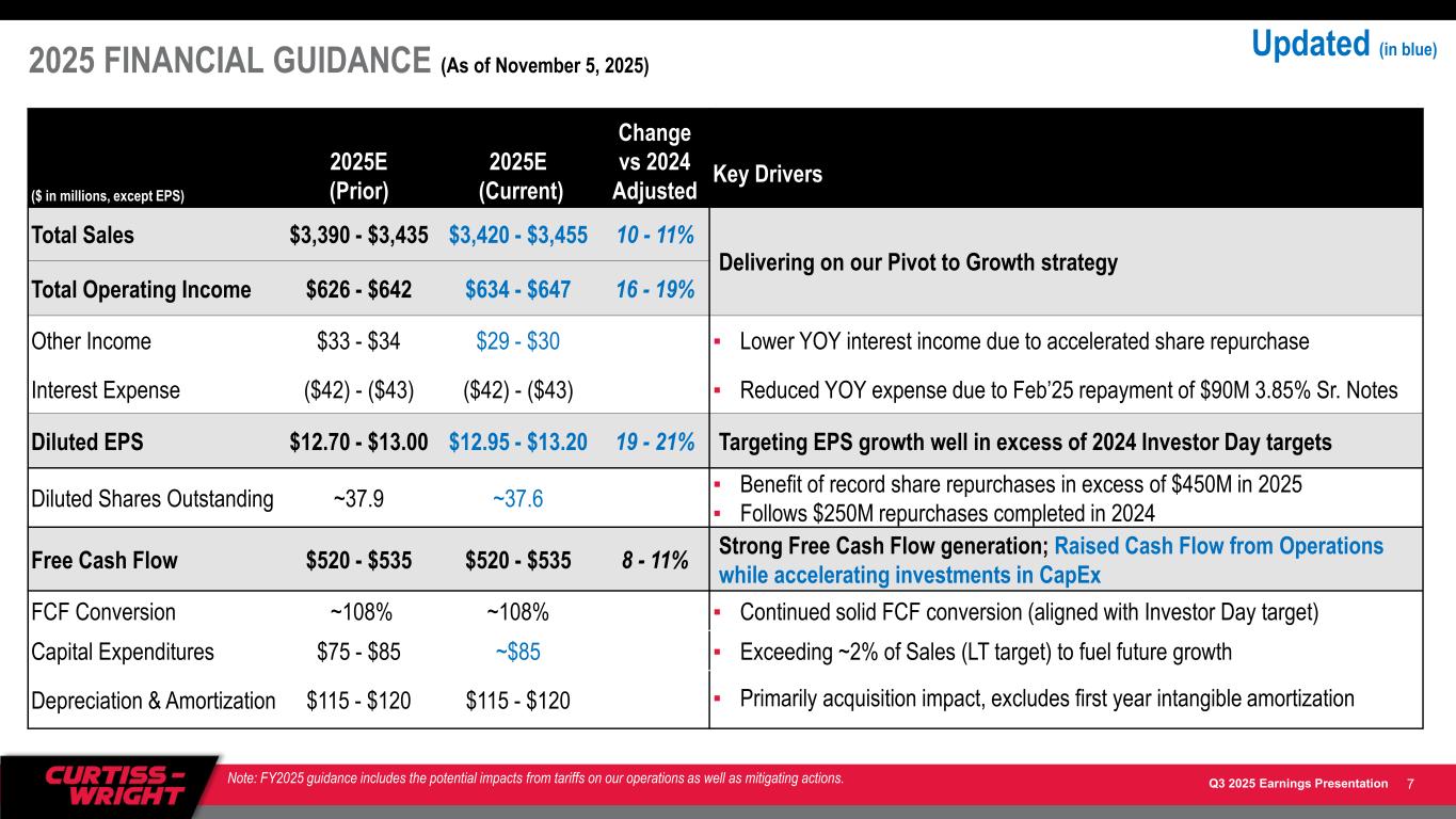 Q3 2025 Earnings Presentation ($ in millions) 2025E (Prior) 2025E (Current) Change vs 2024 Adjusted Key Drivers Aerospace & Industrial $965 - $980 $970 - $980 4 - 5% ▪ Strong growth in Commercial Aerospace and higher EM actuation sales to Defense markets ▪ Flat General Industrial sales (higher automation and services offset by industrial vehicles) Defense Electronics $995 - $1,010 $1,000 - $1,010 10 - 11% ▪ Strong defense market growth (U.S. DoD and dFMS) driven by increased embedded computing and tactical communications revenues ▪ Commercial Aerospace growth reflects increased sales of avionics and flight data recorders Naval & Power $1,430 - $1,445 $1,450 - $1,465 13 - 15% ▪ Mid-to-high teens growth in Power & Process, including PY acquisition; HSD organic growth in Commercial Nuclear and solid organic growth in Process (mainly subsea pump development) ▪ Stronger outlook in Naval Defense (now LDD); Higher dFMS (aircraft handling & arresting systems) Total Sales $3,390 - $3,435 $3,420 - $3,455 10 - 11% Strong order book and backlog driving improved confidence Aerospace & Industrial Margin $167 - $173 17.3% - 17.6% $168 - $173 17.3% - 17.6% 6 - 9% 30 - 60 bps ▪ Favorable absorption on strong growth in A&D revenues ▪ Solid contribution from restructuring savings ▪ Partially mitigating tariff exposure (mainly China) through pricing and operational excellence Defense Electronics Margin $267 - $273 26.8% - 27.0% $271 - $276 27.1% - 27.3% 19 - 22% 220 - 240 bps ▪ Favorable absorption and mix on strong growth in revenues ▪ Benefit of operational and commercial excellence, and restructuring savings ▪ Profitability partially offset by higher investments in R&D Naval & Power Margin $232 - $238 16.3% - 16.5% $236 - $241 16.3% - 16.5% 17 - 20% 50 - 70 bps ▪ Favorable absorption on higher A&D and Power & Process revenues ▪ Profitability partially offset by first-year acquisition dilution and investment in development programs ▪ Partially mitigating tariff exposure (mainly China) through pricing and operational excellence Corporate and Other ($40) - ($42) ($41) - ($43) (5) - 0% Total Op. Income CW Margin $626 - $642 18.5% - 18.7% $634 - $647 18.5% - 18.7% 16 - 19% 100 - 120 bps Operational and commercial excellence contributing to strong operating margin expansion 2025 FINANCIAL GUIDANCE (As of November 5, 2025) 6 Updated (in blue) Notes: Amounts may not add due to rounding; FY2025 guidance includes the potential impacts from tariffs on our operations as well as mitigating actions. dFMS = direct Foreign Military Sales