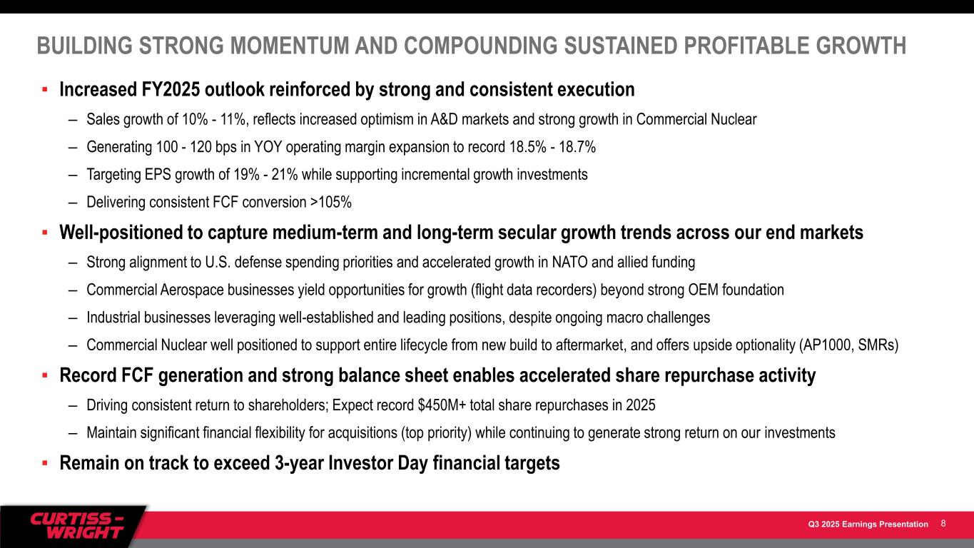 Q3 2025 Earnings Presentation BUILDING STRONG MOMENTUM AND COMPOUNDING SUSTAINED PROFITABLE GROWTH ▪ Increased FY2025 outlook reinforced by strong and consistent execution – Sales growth of 10% - 11%, reflects increased optimism in A&D markets and strong growth in Commercial Nuclear – Generating 100 - 120 bps in YOY operating margin expansion to record 18.5% - 18.7% – Targeting EPS growth of 19% - 21% while supporting incremental growth investments – Delivering consistent FCF conversion >105% ▪ Well-positioned to capture medium-term and long-term secular growth trends across our end markets – Strong alignment to U.S. defense spending priorities and accelerated growth in NATO and allied funding – Commercial Aerospace businesses yield opportunities for growth (flight data recorders) beyond strong OEM foundation – Industrial businesses leveraging well-established and leading positions, despite ongoing macro challenges – Commercial Nuclear well positioned to support entire lifecycle from new build to aftermarket, and offers upside optionality (AP1000, SMRs) ▪ Record FCF generation and strong balance sheet enables accelerated share repurchase activity – Driving consistent return to shareholders; Expect record $450M+ total share repurchases in 2025 – Maintain significant financial flexibility for acquisitions (top priority) while continuing to generate strong return on our investments ▪ Remain on track to exceed 3-year Investor Day financial targets 8