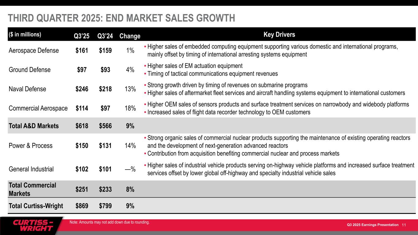Q3 2025 Earnings Presentation NON-GAAP FINANCIAL INFORMATION The Corporation supplements its financial information determined under U.S. generally accepted accounting principles (GAAP) with certain non-GAAP financial information. Curtiss-Wright believes that these Adjusted (non-GAAP) measures provide investors with improved transparency in order to better measure Curtiss-Wright’s ongoing operating and financial performance and better comparisons of our key financial metrics to our peers. These non-GAAP measures should not be considered in isolation or as a substitute for the related GAAP measures, and other companies may define such measures differently. Curtiss-Wright encourages investors to review its financial statements and publicly filed reports in their entirety and not to rely on any single financial measure. Reconciliations of “Reported” GAAP amounts to “Adjusted” non-GAAP amounts are furnished within the Company’s earnings press release. The following definitions are provided: Adjusted Operating Income, Operating Margin, Net Earnings and Diluted Earnings per Share (EPS) These Adjusted financials are defined as Reported Operating Income, Operating Margin, Net Earnings and Diluted Earnings per Share under GAAP excluding: (i) the impact of first year purchase accounting costs associated with acquisitions, specifically one-time inventory step-up, backlog amortization, deferred revenue adjustments, transaction costs, and gains/losses on equity securities held for investment purposes; and (ii) costs associated with the Company's 2024 Restructuring Program, as applicable. Organic Sales and Organic Operating Income The Corporation discloses organic sales and organic operating income because the Corporation believes it provides investors with insight as to the Company’s ongoing business performance. Organic sales and organic operating income are defined as sales and operating income, excluding contributions from acquisitions and results of operations from divested businesses or product lines during the last twelve months, costs associated with the Company's 2024 Restructuring Program, and foreign currency fluctuations. Free Cash Flow (FCF) and Free Cash Flow Conversion The Corporation discloses free cash flow because it measures cash flow available for investing and financing activities. Free cash flow represents cash available to repay outstanding debt, invest in the business, acquire businesses, return capital to shareholders and make other strategic investments. Free cash flow is defined as net cash provided by operating activities less capital expenditures. The Corporation discloses free cash flow conversion because it measures the proportion of net earnings converted into free cash flow and is defined as free cash flow divided by adjusted net earnings. 10