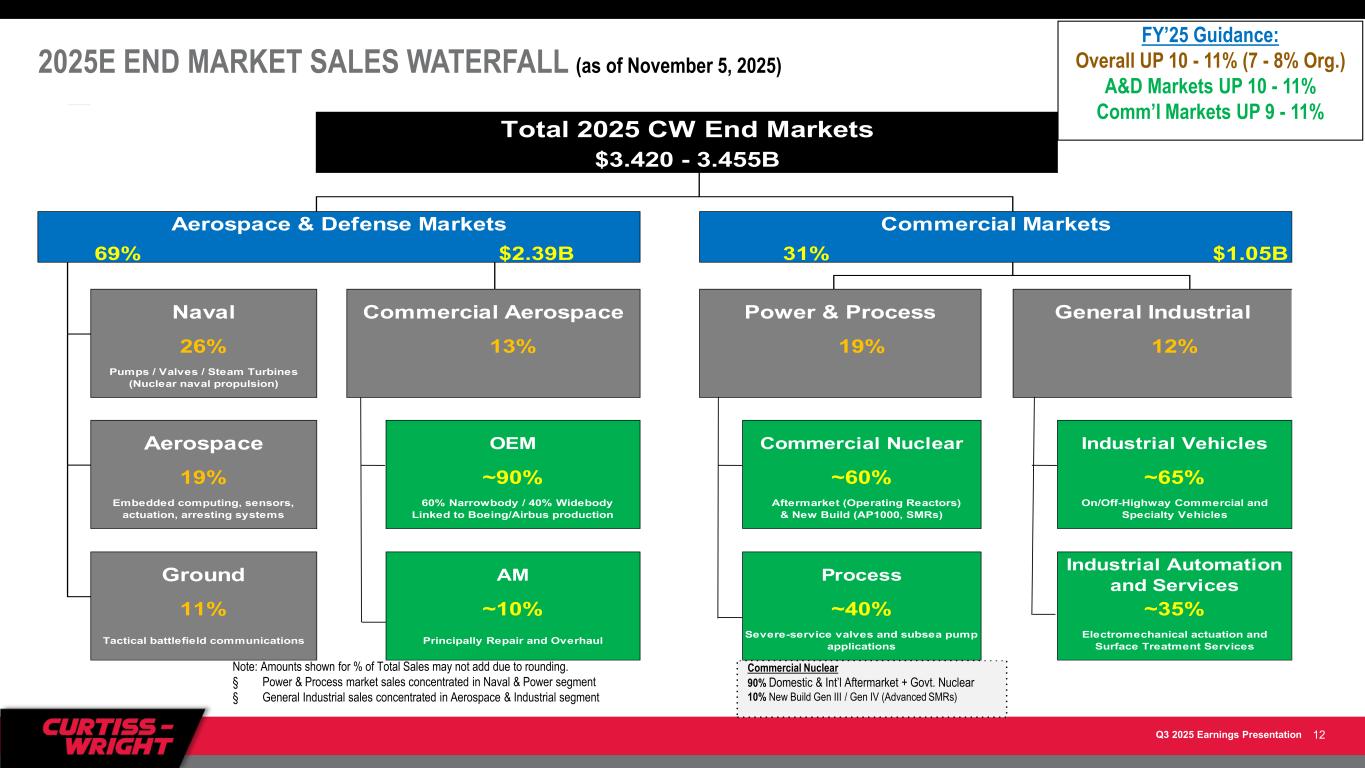 Q3 2025 Earnings Presentation THIRD QUARTER 2025: END MARKET SALES GROWTH ($ in millions) Q3’25 Q3’24 Change Key Drivers Aerospace Defense $161 $159 1% ▪ Higher sales of embedded computing equipment supporting various domestic and international programs, mainly offset by timing of international arresting systems equipment Ground Defense $97 $93 4% ▪ Higher sales of EM actuation equipment ▪ Timing of tactical communications equipment revenues Naval Defense $246 $218 13% ▪ Strong growth driven by timing of revenues on submarine programs ▪ Higher sales of aftermarket fleet services and aircraft handling systems equipment to international customers Commercial Aerospace $114 $97 18% ▪ Higher OEM sales of sensors products and surface treatment services on narrowbody and widebody platforms ▪ Increased sales of flight data recorder technology to OEM customers Total A&D Markets $618 $566 9% Power & Process $150 $131 14% ▪ Strong organic sales of commercial nuclear products supporting the maintenance of existing operating reactors and the development of next-generation advanced reactors ▪ Contribution from acquisition benefiting commercial nuclear and process markets General Industrial $102 $101 —% ▪ Higher sales of industrial vehicle products serving on-highway vehicle platforms and increased surface treatment services offset by lower global off-highway and specialty industrial vehicle sales Total Commercial Markets $251 $233 8% Total Curtiss-Wright $869 $799 9% 11 Note: Amounts may not add down due to rounding.